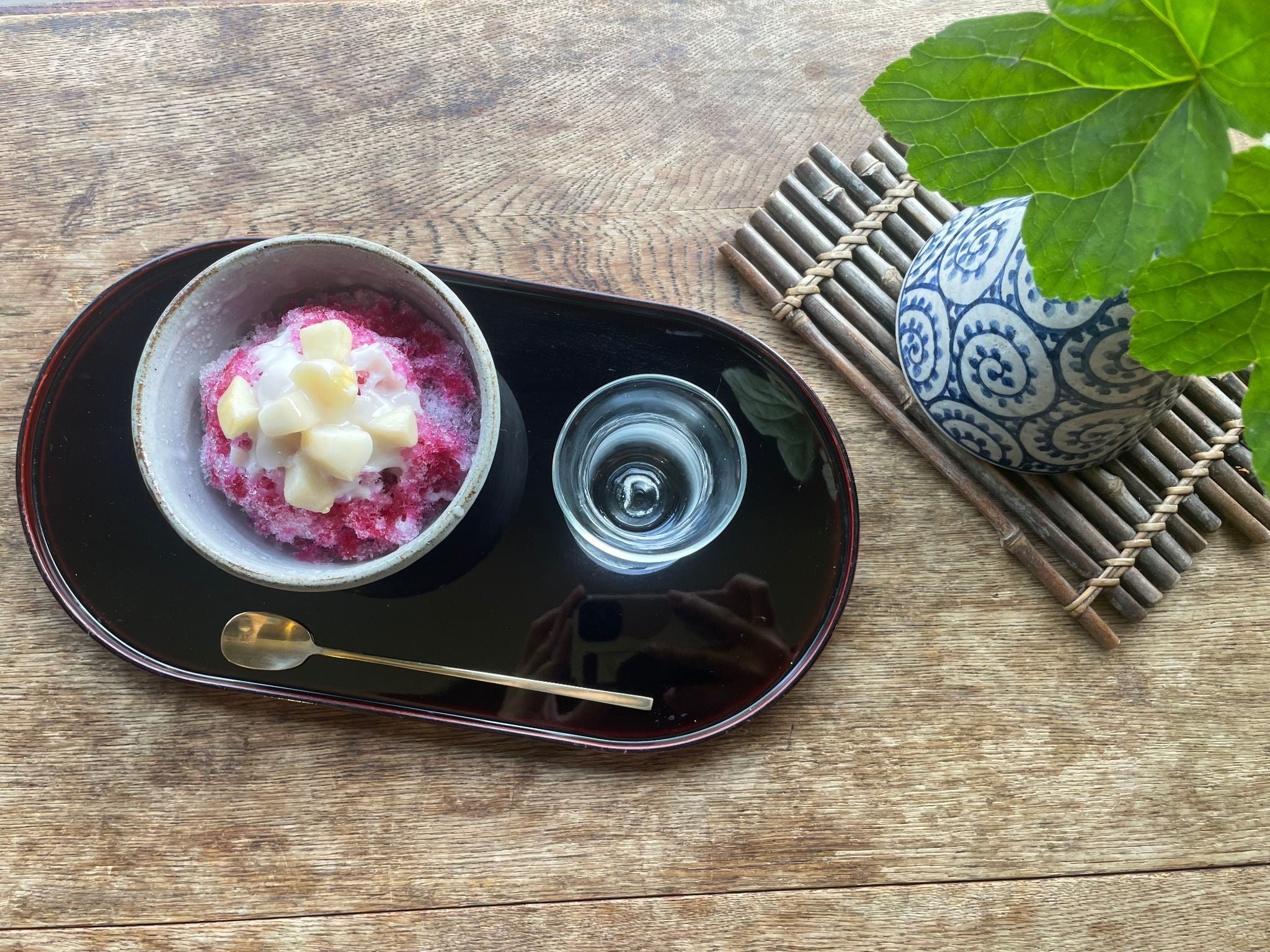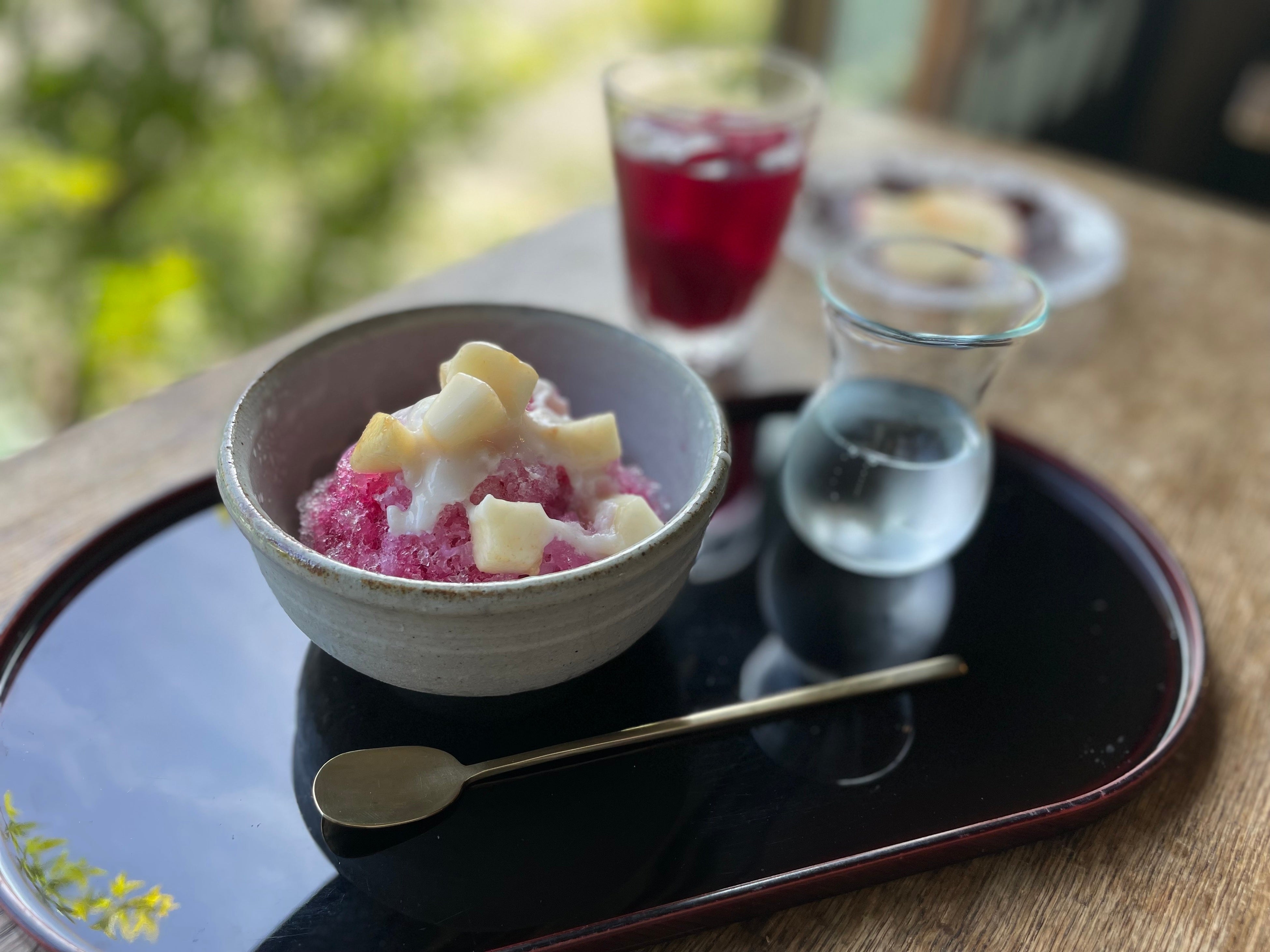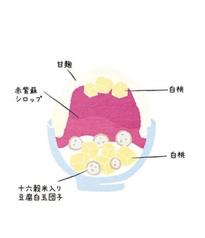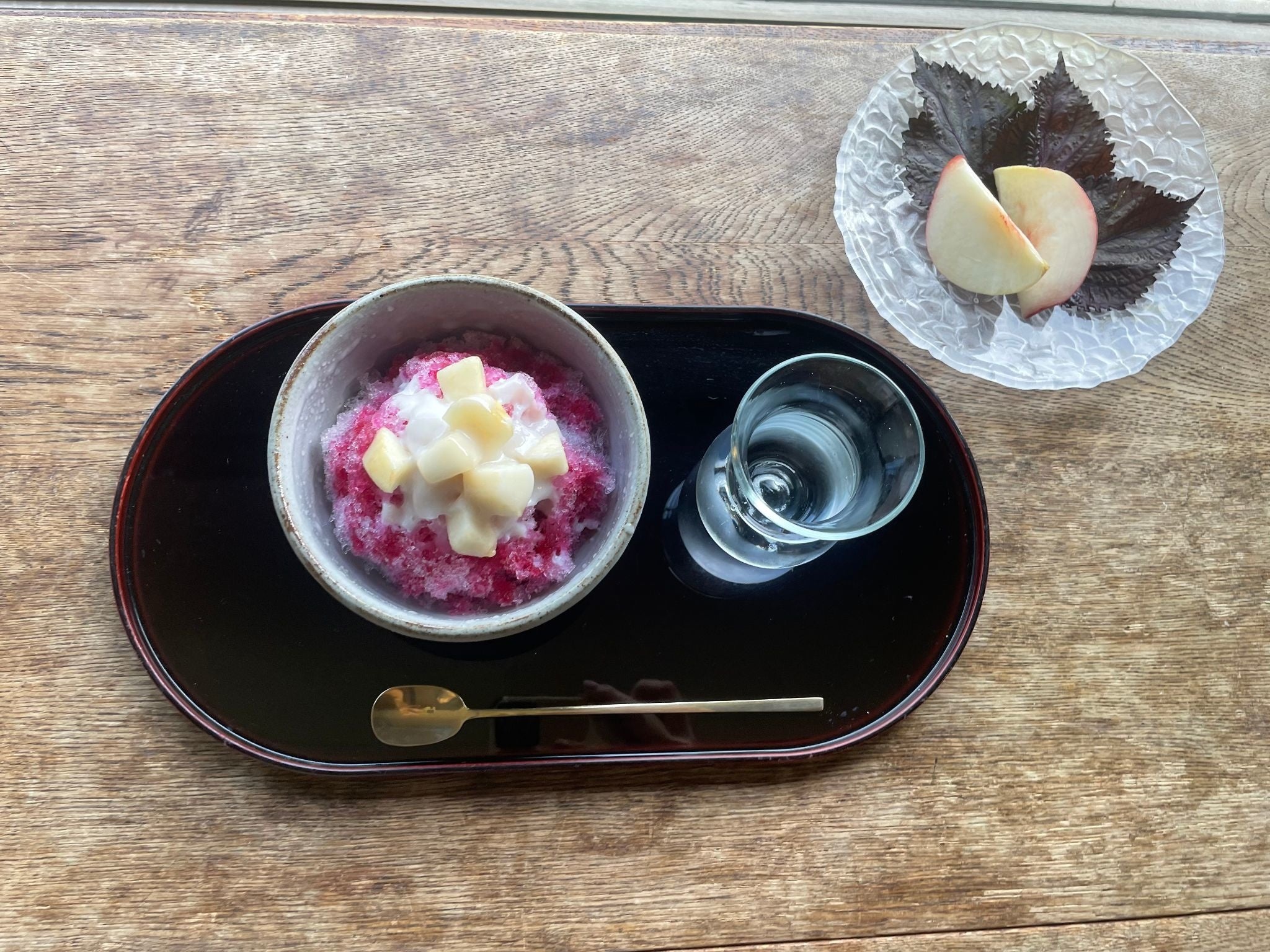 桃をたっぷり使用したかき氷に、赤紫蘇シロップを。自家製の甘麹シロップがアクセントに。