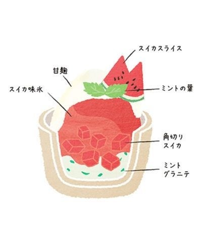 自家栽培のミントのグラニテの上に、スイカ氷を。その上にかかった甘麹シロップがアクセントに。無糖ソーダで「割る」とスイカミントソーダがさっぱり美味。