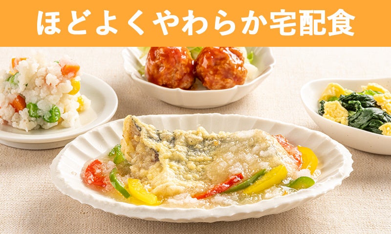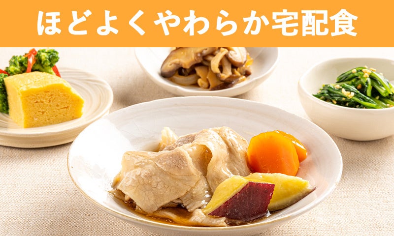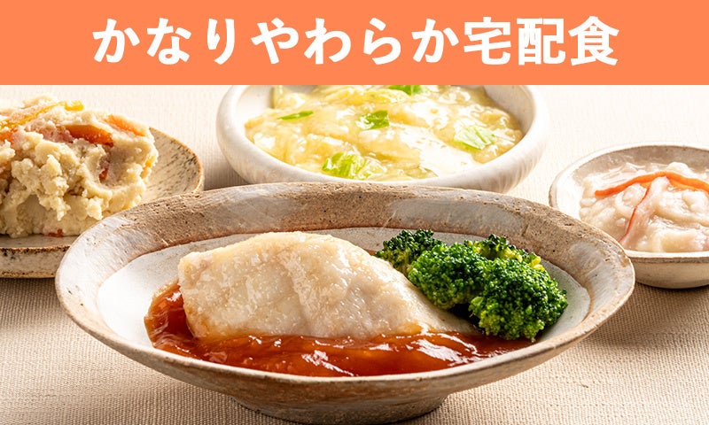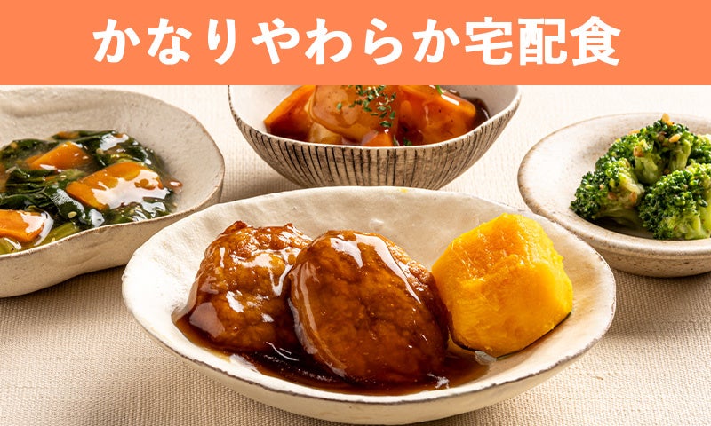 『やわらか宅配食』は、噛む力・飲み込む力が低下していても安心して召し上がっていただけるよう、3段階のやわらかさから選べる介護食です。