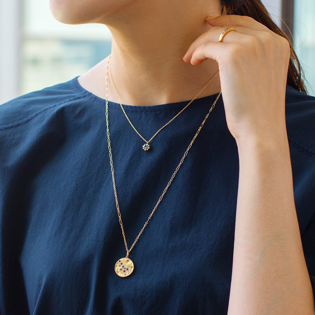 直径約17mmのコイン型のペンダントトップは、着けるだけで注目を集める存在感。コーディネートを引き締めるだけでなく、体の中心軸に視線を集めることで、全身のスタイルアップも叶えます。ロングチェーンを通せば、縦のシルエットが強調され、さらにスタイリッシュな佇まいに。シンプルなフォルムは日常に寄り添ってくれながら、宝石とたっぷりの地金がラグジュアリーに煌めきます。