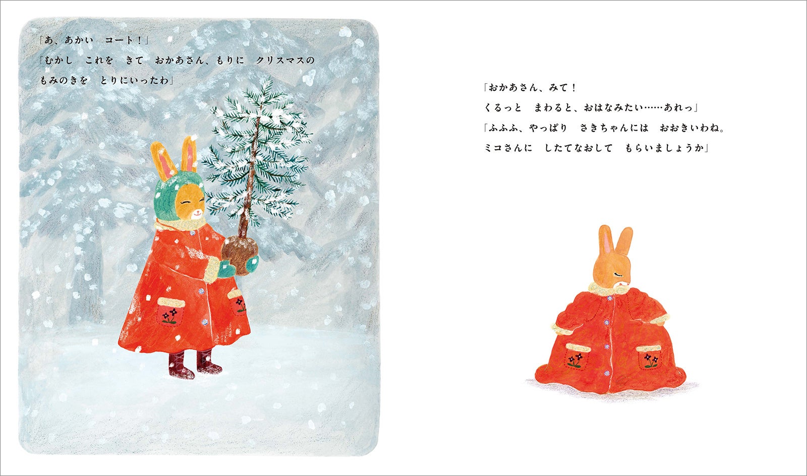 雪のふる、しずかな朝です。はやく外に出てあそびたいさきちゃんを、おかあさんは屋根裏部屋へつれていきました。大きな箱をあけると、そこにはおかあさんの赤いコート。着てみるとさきちゃんにはおおきいみたい...。「ミコさんに、したてなおしてもらいましょう」とお店にむかいます。