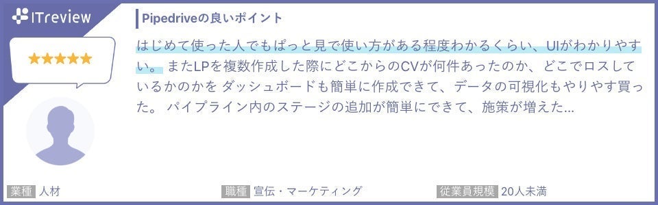 「Pipedrive」は、ITreviewで平均★4.6(2025年1月15日時点)という高評価を獲得し、実際のユーザーからも「営業プロセスの効率化が劇的に進んだ」「使いやすいUIで、誰でも簡単に操作できる」などの声をいただいています。当製品のご利用者様から実際に寄せられたレビューを一部ご紹介します。