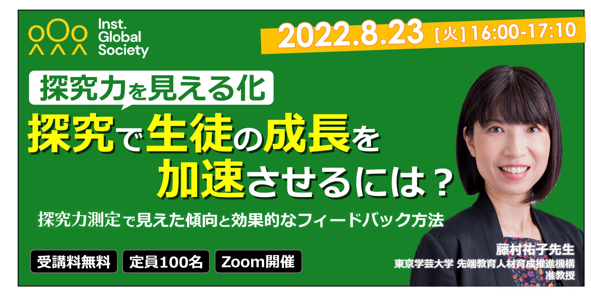 Institution for a Global Society 株式会社(本社 東京都渋谷区、代表取締役社長 福原 正大、以下 IGS)は、「~探究力を見える化~探究で生徒の成長を加速させるには?(探究力測定で見えた傾向と効果的なフィードバック方法)」を、2022年8月23日(火)16:00〜17:10にオンラインで開催いたします。