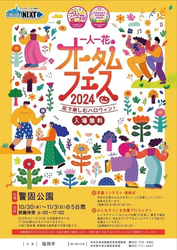 内容|「花で楽しむハロウィン」をコンセプトに、市民の皆様に作成いただく花壇装飾や市民花壇コンテスト、ハロウィンを楽しむオブジェの設置などにより、警固公園をたくさんの花で彩ります。令和7年3月23日から27日に福岡市植物園で開催される「花の祭典(Fukuoka Flower
