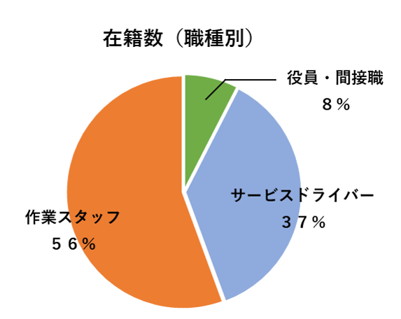 当社に在籍している従業員の職種別割合は、トラックを運転し配送を行うサービスドライバーが37%、倉庫内での仕分け作業や伝票整理・データ入力等の事務作業を行う作業スタッフが56%となっており、多くの従業員がそれぞれの役割を全うし、当社の物流を支えています。