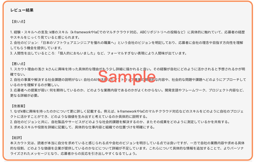 スカウト送信画面にスカウトメッセージを入力し、【AIによるレビュー(α版)を実行】を押下することで、AIが文章を分析し、以下の内容でレビュー結果が返ってきます。
