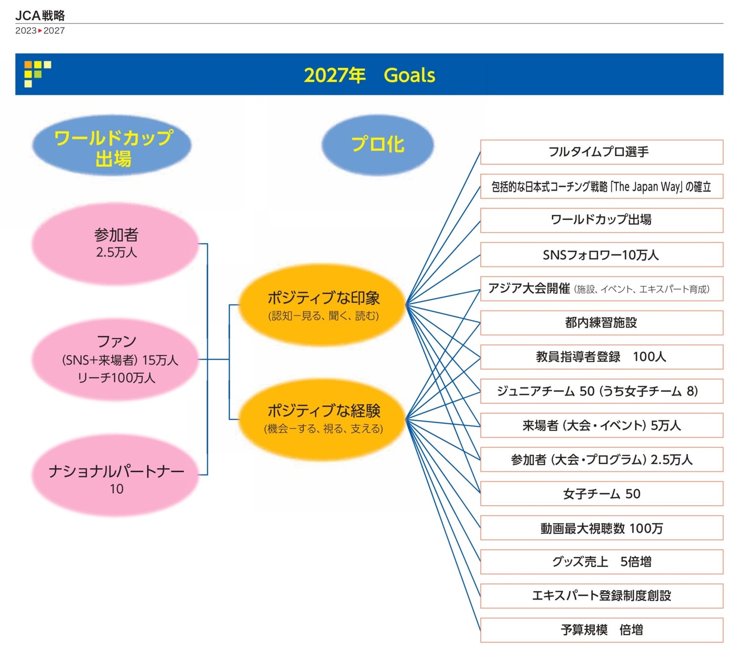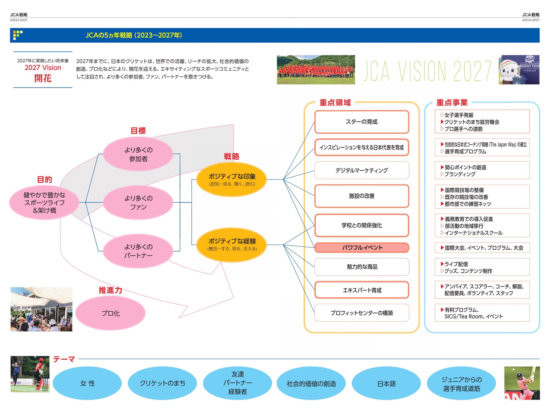 2023~2027年の5か年戦略「開花」では、「2027年までに、日本のクリケットは、世界での活躍、リーチの拡大、社会的価値の創造、プロ化などにより、開花を迎える。エキサイティングなスポーツコミュニティとして注目され、より多くの参加者、ファン、パートナーを惹きつける。」を2027年Visionに掲げております。