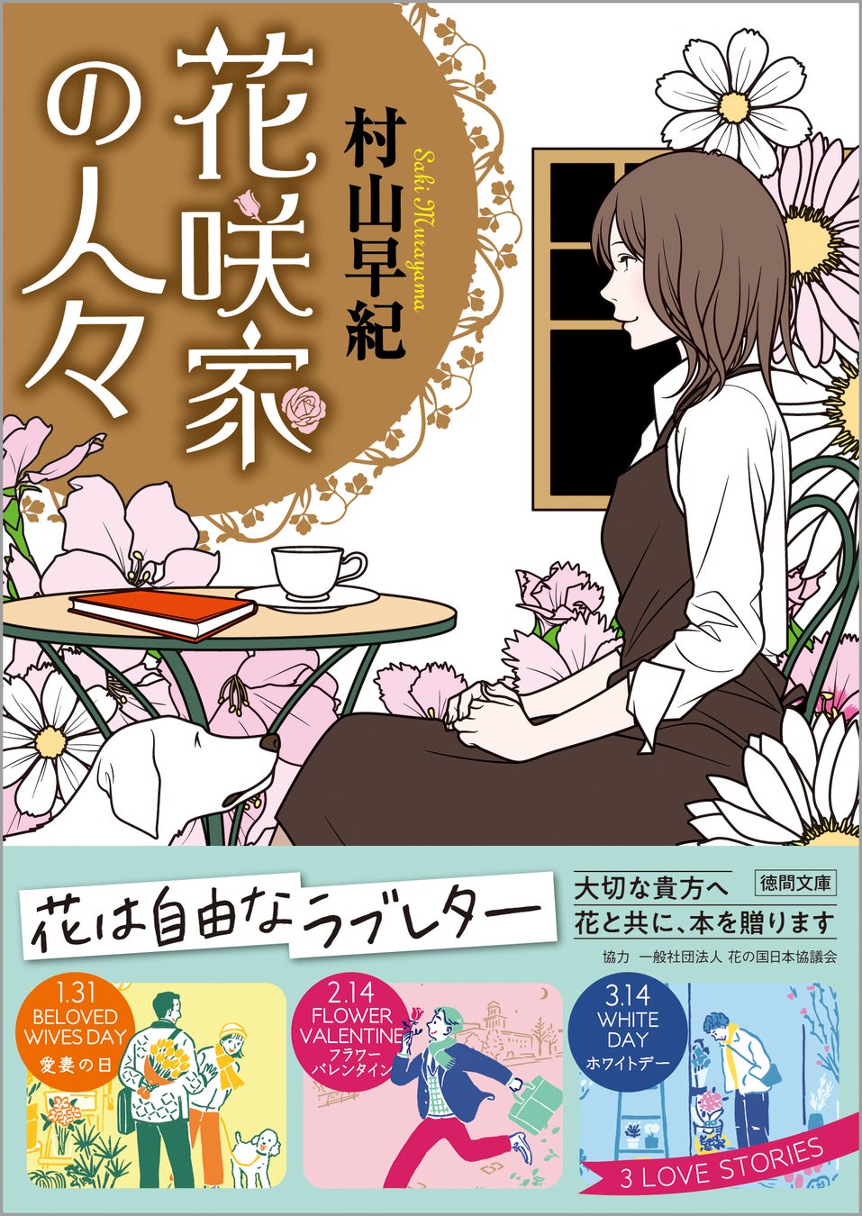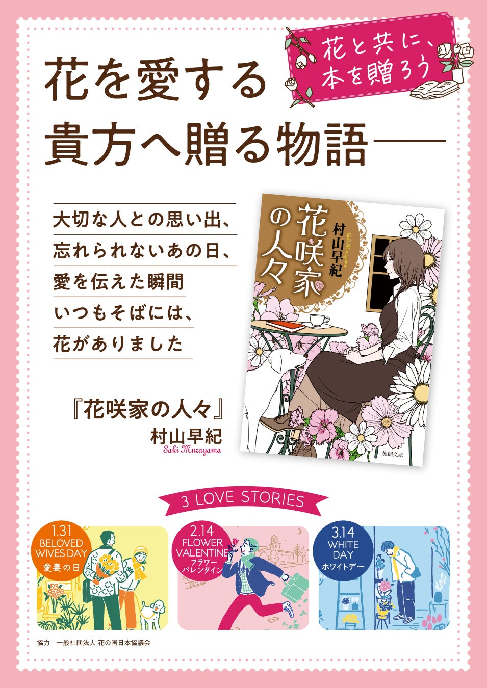 株式会社徳間書店では、若手編集者たちのアイデアで「今の若者にぜひ読んでほしい心温まる小説」に村山早紀氏著の『花咲家の人々』を選出。さらに、花の国日本協議会が提案する「3 LOVE STORIES」とコラボしながら「花と共に本を贈ろう」と全国の書店でPRします。書籍の帯や書店に設置されるPOPデザインに、「3 LOVE STORIES」のイラストが採用されました。