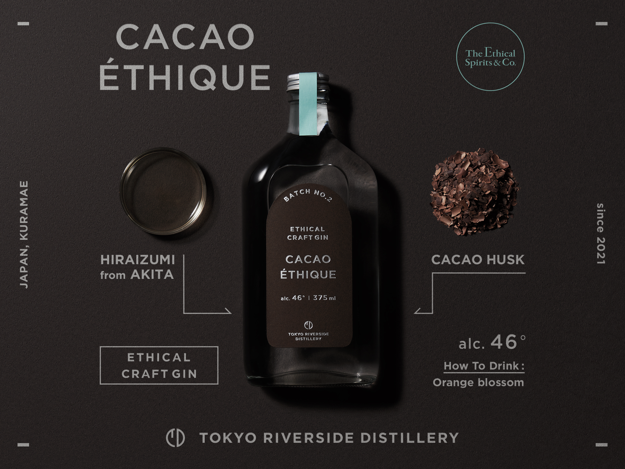 カカオハスクは、通常のチョコレート作りにおいてカカオをローストする加工工程で分離&廃棄されている皮部分。香気成分を取り出す “蒸留” との相性が非常に良いということを発見。 リッチでバランスの取れたカカオの風味とともに、フルーティーでハーバルな特徴をもつ「エシカル・ジン」となりました。オレンジジュースと合わせて、オレンジブロッサムとして飲むのがおすすめ。