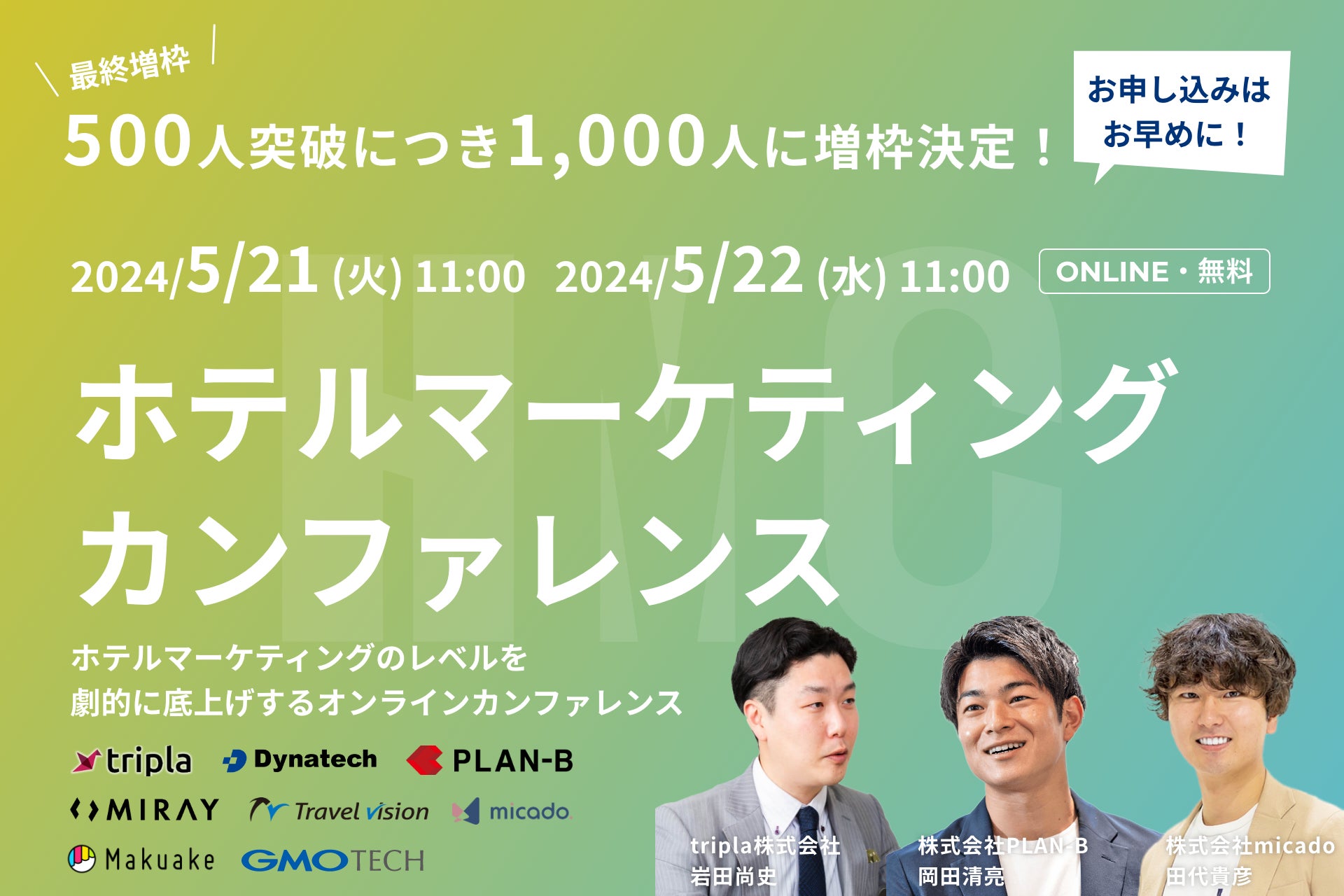 2024年5月21日〜22日に開催するHMC(ホテルマーケティングカンファレンス)の参加募集を開始し、約1ヶ月で500施設以上のホテル・旅館さまからご応募をいただき、最後の”増枠”をいたしました。