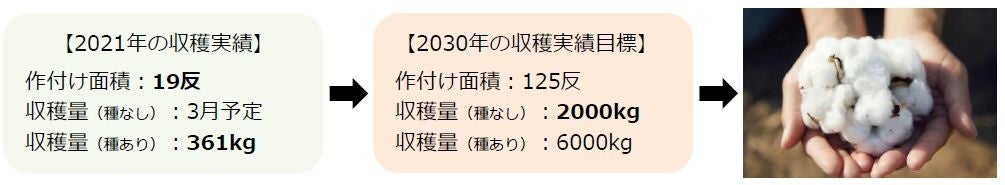 「国産綿復活プロジェクト」 は、日本の綿自給率1%を目指しています。また、2030年までに、本プロジェクトにて生まれた綿をプリスティンの製品に2%(2トンの収穫量)入れ込むことを目標としています。
