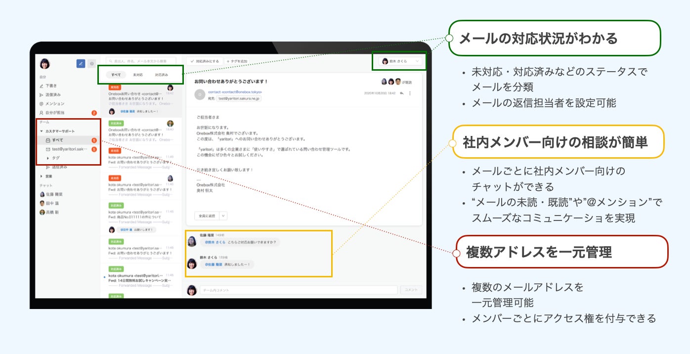 yaritoriは、対外的な顧客対応を担う営業・CSに特化したメールサービスです。「複数メールの対応状況をチームで一元管理」「Slack・Chatwork連携」などで社内外のコミュニケーションを効率化し、迅速な顧客対応を実現することができます。