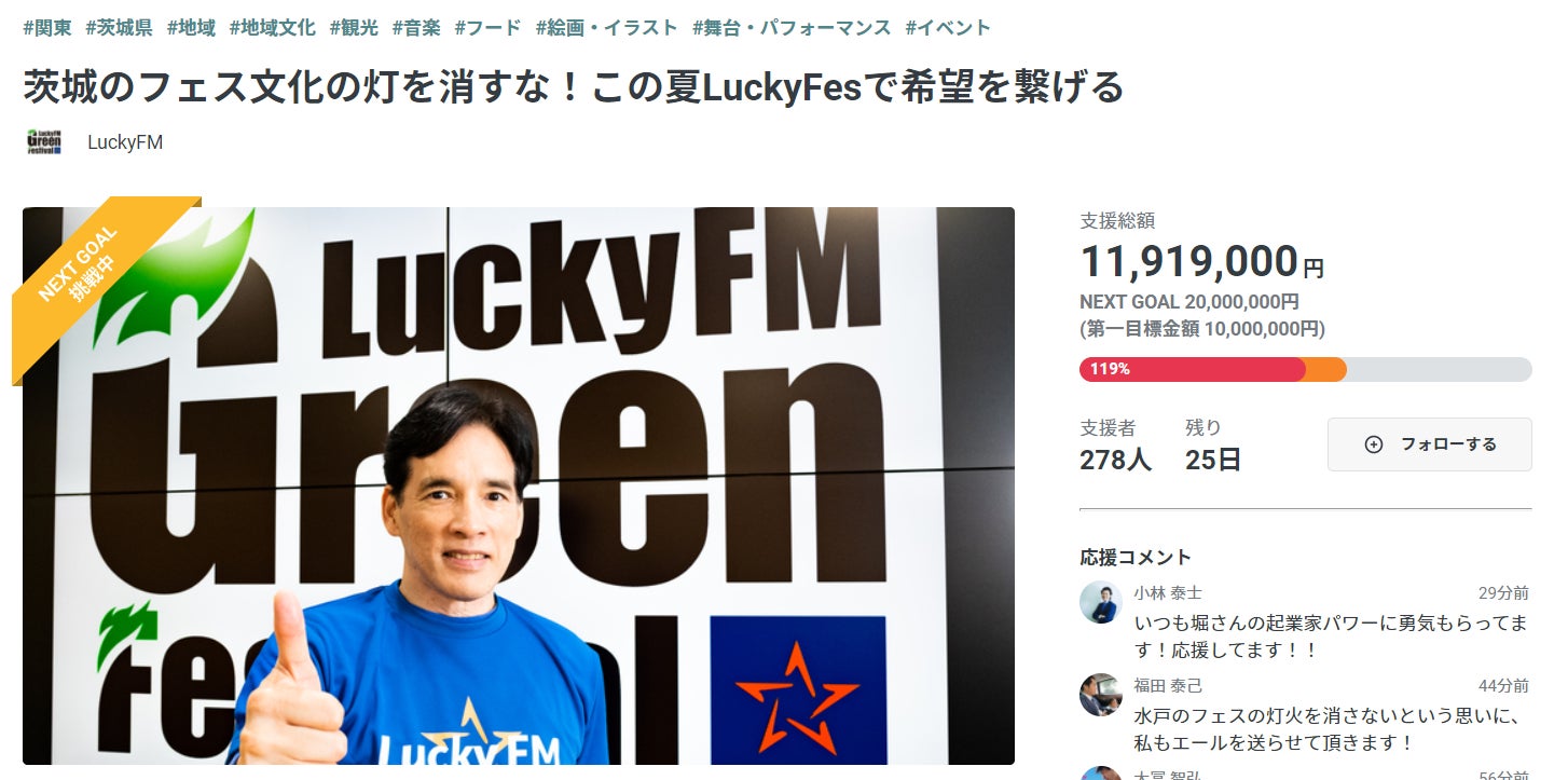 株式会社茨城放送(本社所在地:茨城県水戸市)は、3月9日からLuckyFM Green Festival(通称:LuckyFes)の運営費用としてクラウドファンディングサービス「READYFOR」にて支援金の募集を開始、5日間で278人を超える方々に賛同いただき、早くも第一目標金額の1,000万円を達成しました。クラウドファンディングの支援金の募集期間は4月8日までで、最終目標の2,000万円に向けて募集を継続する予定です。