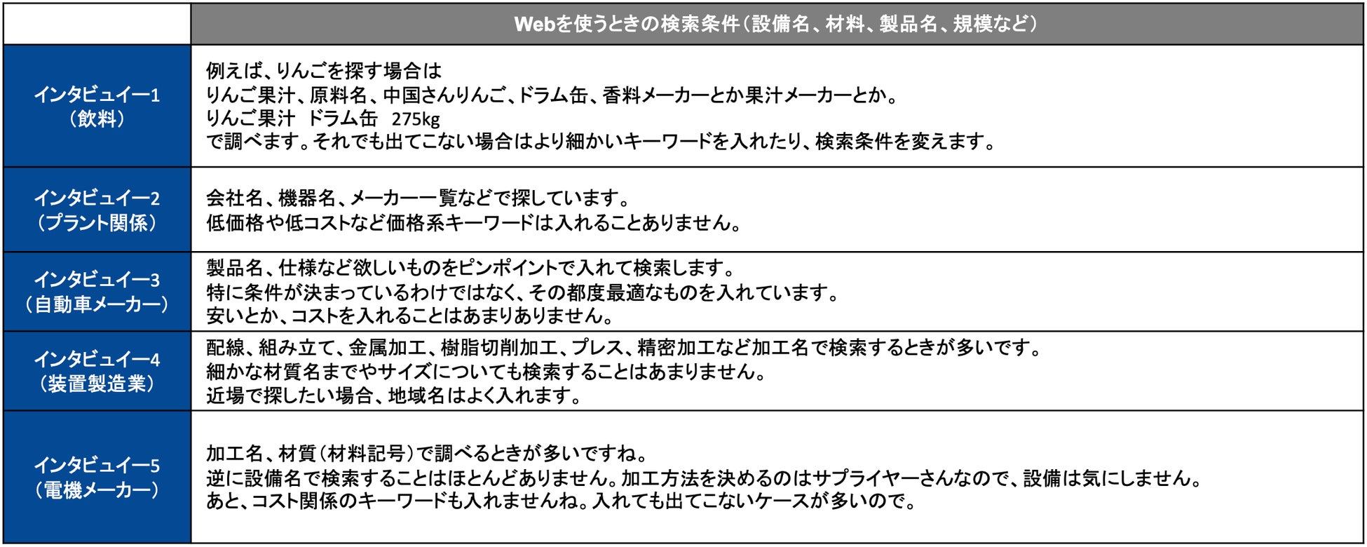 今回は、大手メーカーの購買部門に所属し、インターネットで新規発注先となるサプライヤー企業を探索した経験のある5名を対象に、サプライヤー企業の探し方と選定基準についてインタビュー調査しました。