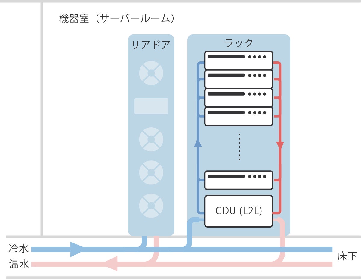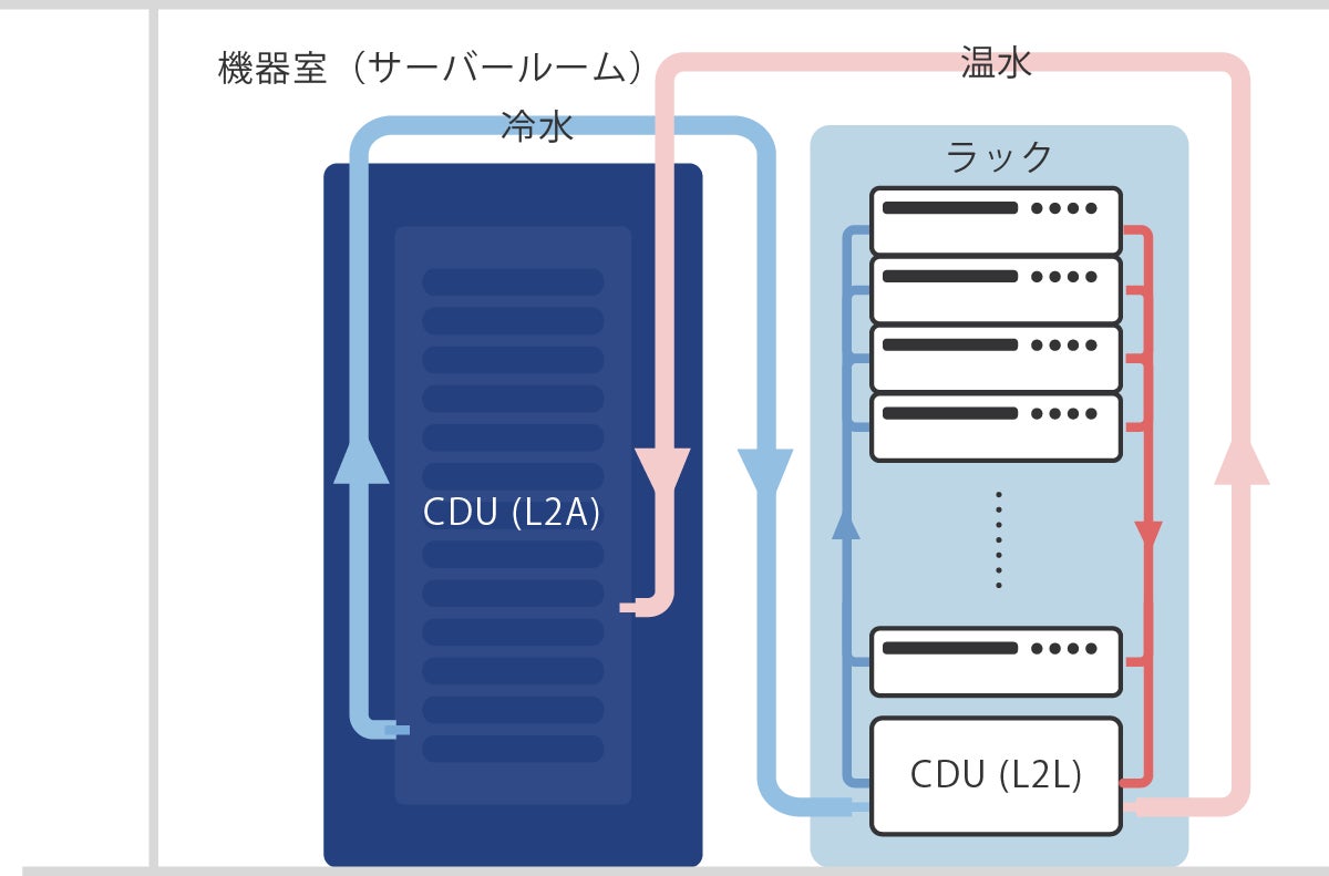 お客さまにご用意いただいたCDU(冷却分配装置)含むサーバーラック一式を設置できる環境を、最短納期2ヵ月でスピーディーに構築します。