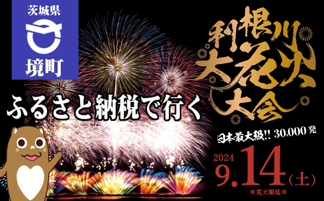 2024年9月14日(土)茨城県境町(町長:橋本正裕)では、茨城が誇る山﨑煙火製造所と野村花火工業、長野県の紅屋青木煙火店、山梨県のマルゴーの4大花火師を招き、日本最大級3万発を打ち上げる音楽花火「第37回利根川大花火大会」を開催します。このたびチケット販売がご好評につき、ふるさと納税返礼品として「最前列で見るラグジュアリー席2名様分」ほか、観覧席をご用意いたしました。