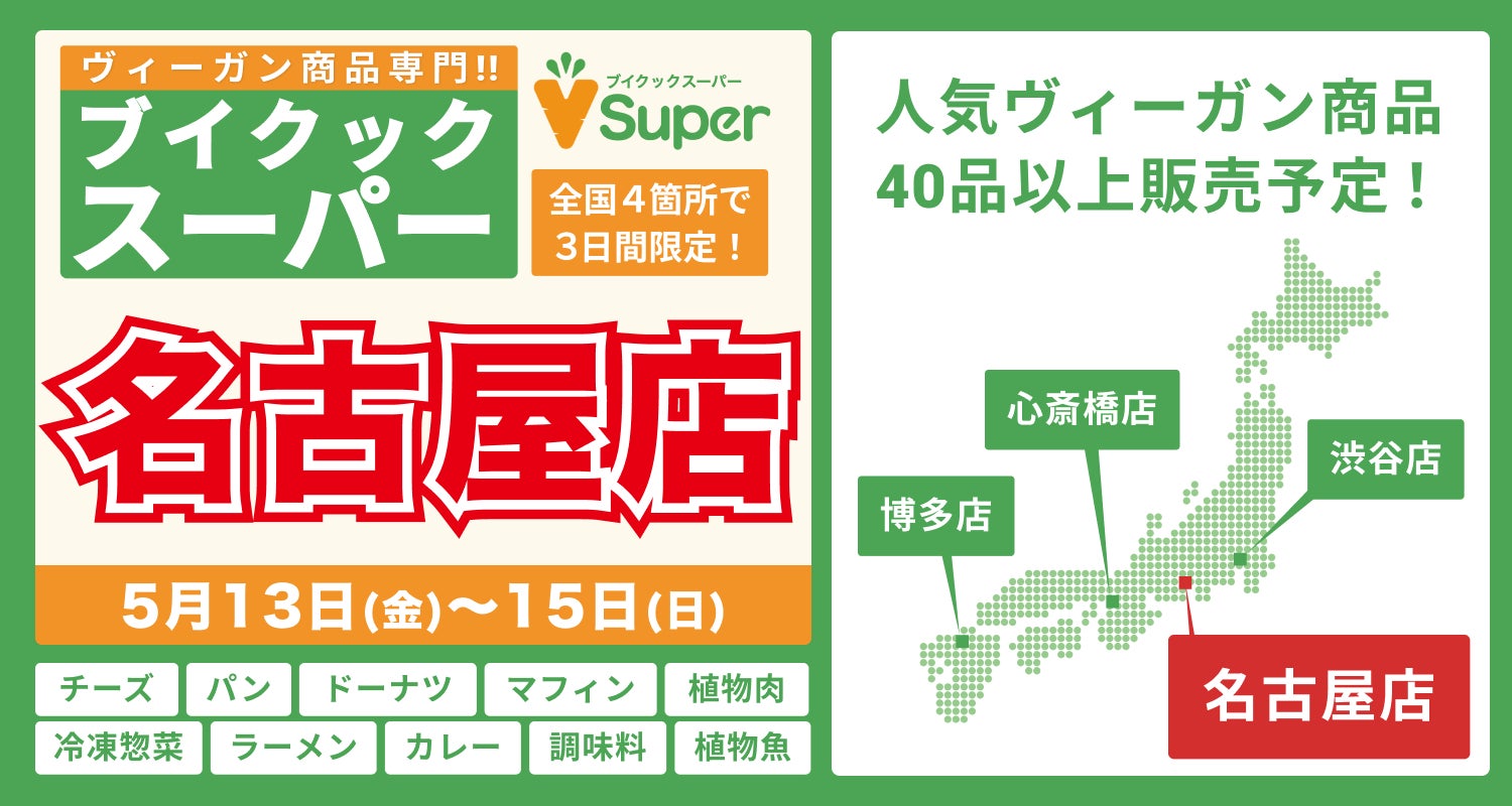 株式会社ブイクック(本社:兵庫県神戸市、代表取締役:工藤柊)は、2022年5月13日(金)〜5月15日(日)、名古屋にて3日間限定のヴィーガン商品専門「ブイクックスーパー」を開店いたします。
