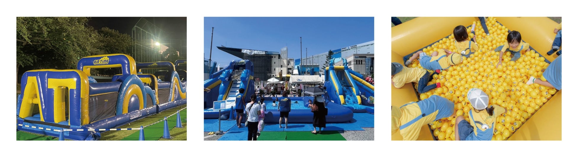 サンセットビーチの砂浜に展開される大型スライダー等エア遊具やミニオンズランならではのアトラクションがたくさん!他にも、とびきり可愛いフォトスポットでの撮影や、ビニールショルダーバッグやステッカーを含むイベントキット付きチケット、そしてさらにTシャツも付いてくるチケットの2種類を販売、とにかくミニオンづくしで楽しめる!
