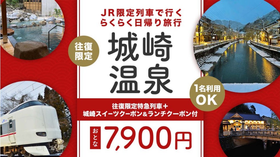 【日帰り7,100円】関西発JR限定列車で行く!日帰りプラン城崎★スイーツクーポン&ランチクーポン付【1名様からご利用OK】日帰りプラン新登場!!