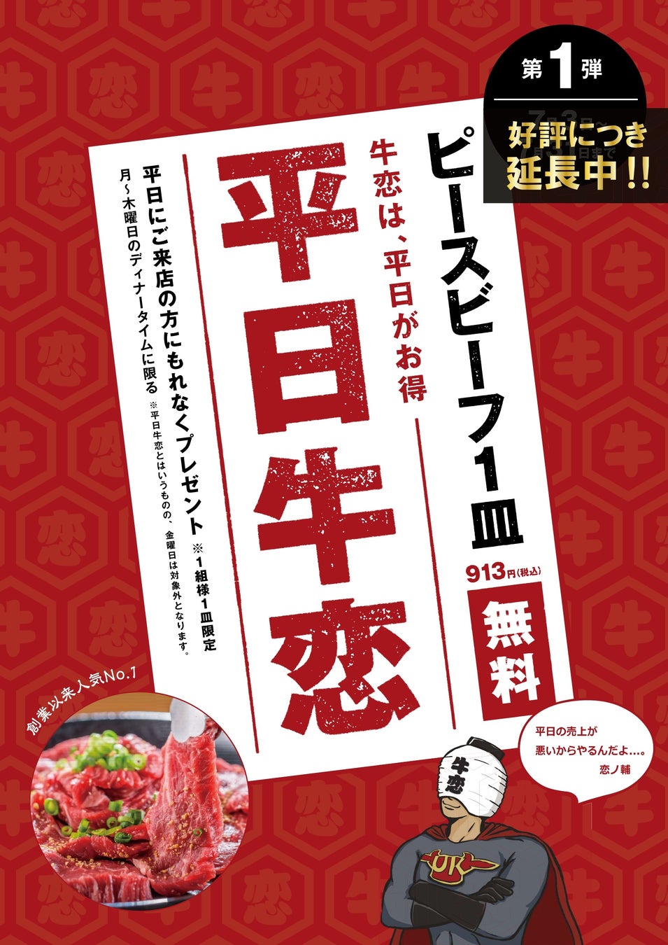 【大好評につき期間延長!】焼肉屋牛恋 看板商品「ピースビーフ」を無料提供!平日来店がお得な「平日牛恋」!