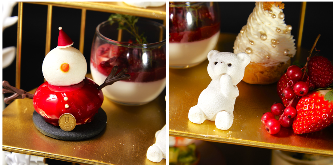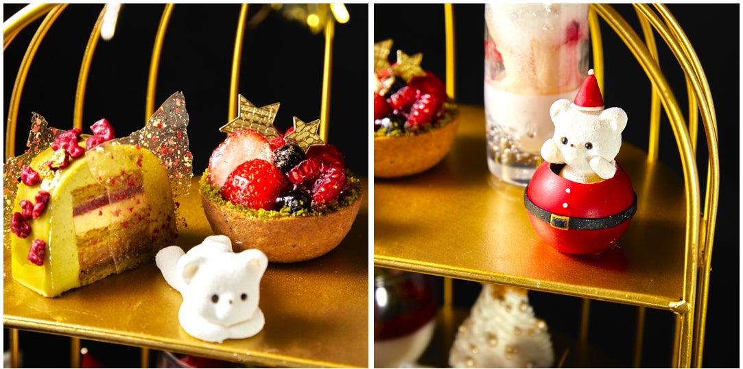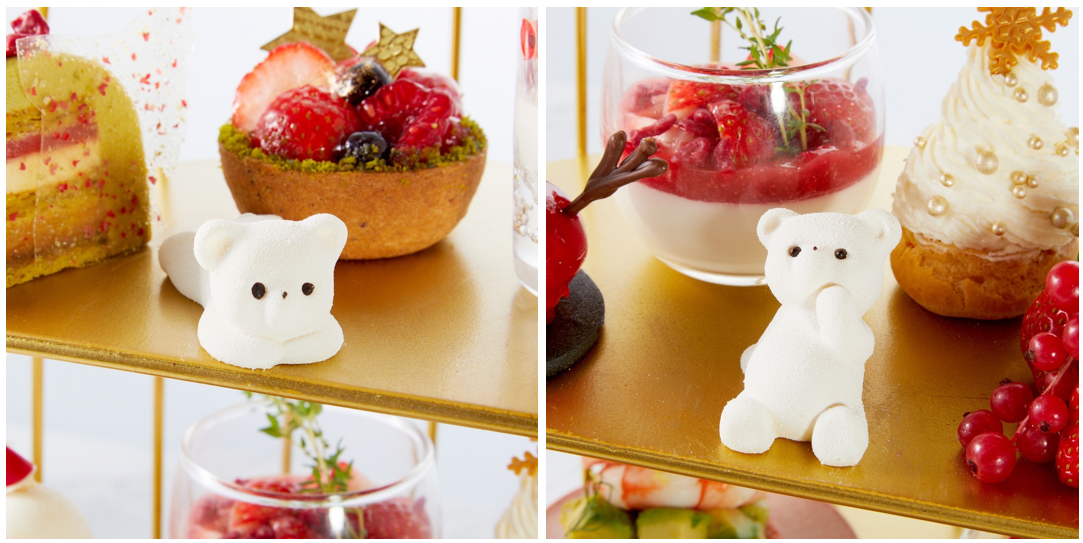 スイーツは可愛らしい「ベリームースのハッピースノーマン」や、ツリー型の「チーズと柚子のシュー」など7種類をご用意しました。セイボリーも「ポテトサラダのスノーマン」と「カプレーゼのサンタ」など、クリスマス感満載のメニューを揃えました。ドリンクは、茶葉を砕かずそのまま用いたホールリーフにこだわる「Mighty Leaf」のティーを9種類ご提供しております。おかわり自由でゆったりとしたティータイムをお過ごしいただけます。LOUANGE TOKYO人気のテディベア“ヌーミー”も真っ白な姿でサンタクロースに大変身、期間限定の可愛らしい姿をお見逃しなく。