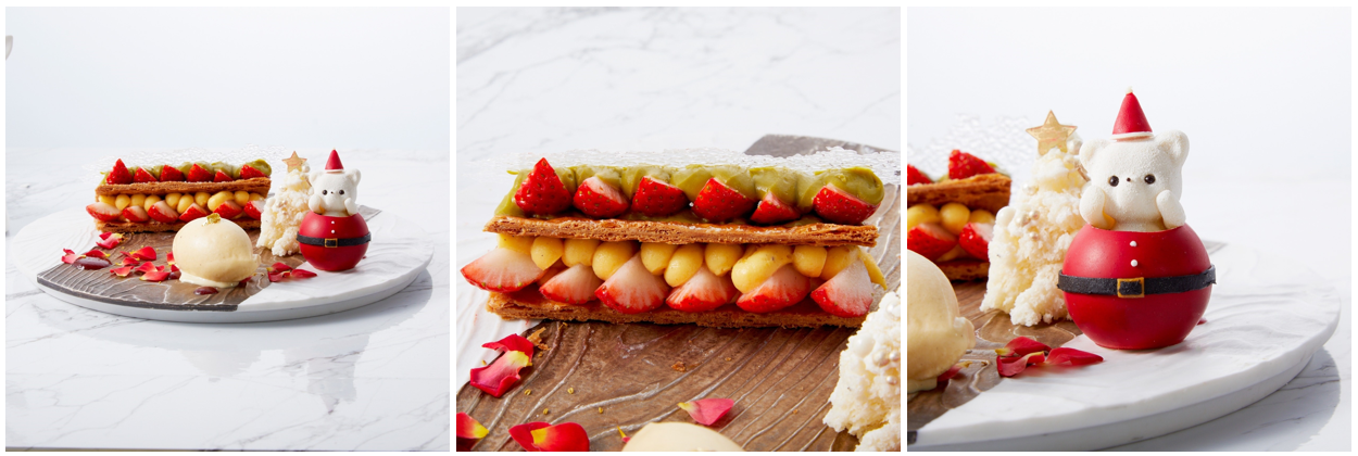 今年はさらに、苺とピスタチオのミルフィーユにバニラアイスを添えた「ノエル ミルフィーユ」のアシェットデセールもご用意しました。苺の甘酸っぱさと濃厚なピスタチオは相性抜群。サクサクのパイと2種類のクリームを合わせ、真っ白な姿のサンタヌーミーと小さなツリーを飾った、見た目も彩り豊かなミルフィーユに仕上げました。
