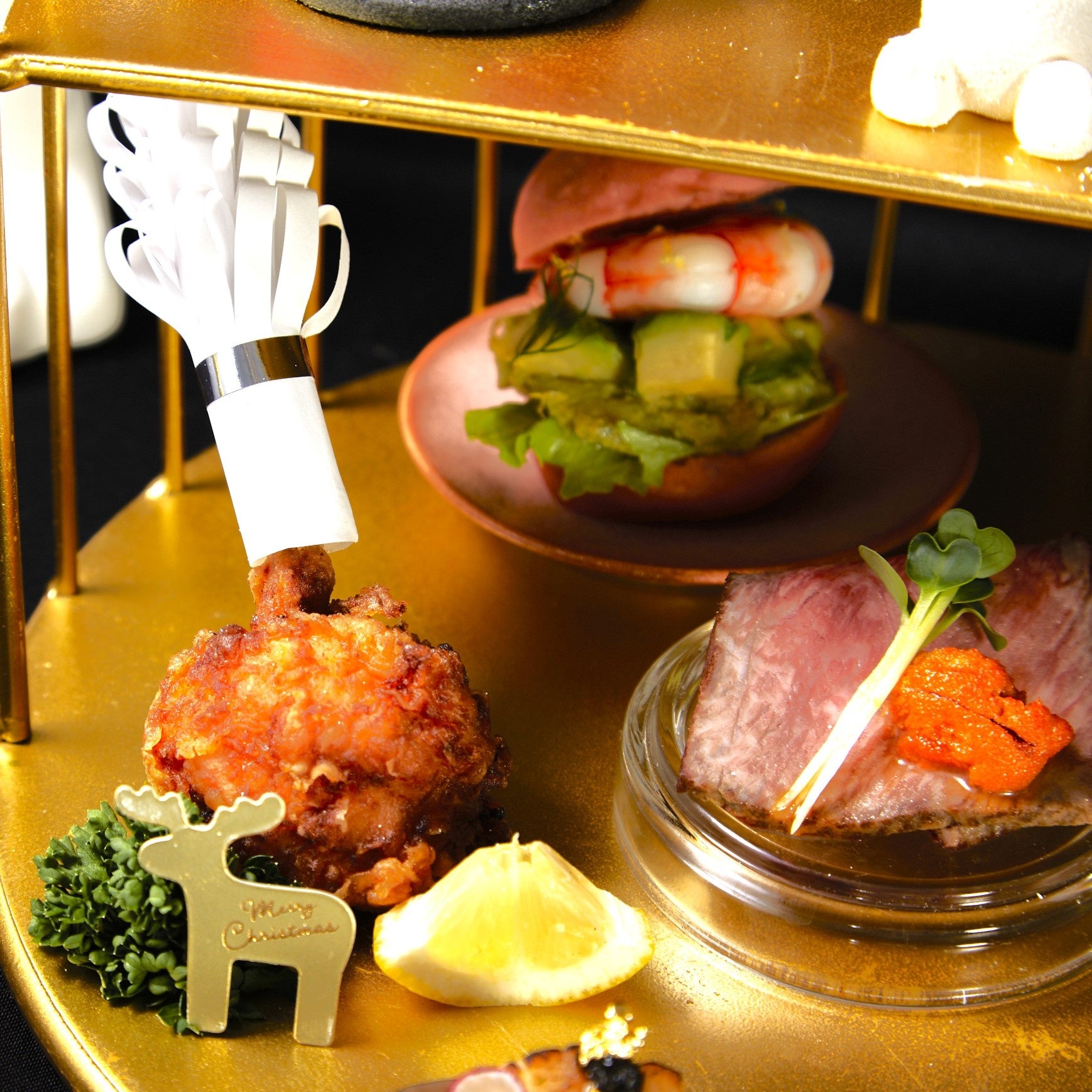 コーンクリームシチューとグリル野菜 / 海老とアボカドのフレッシュバーガー / A5黒毛和牛のローストビーフと雲丹 / 照り焼き風 チキンドラム チューリップ / ポテサラ スノーマンとカプレーゼサンタ / 帆立の炙りとキャビア