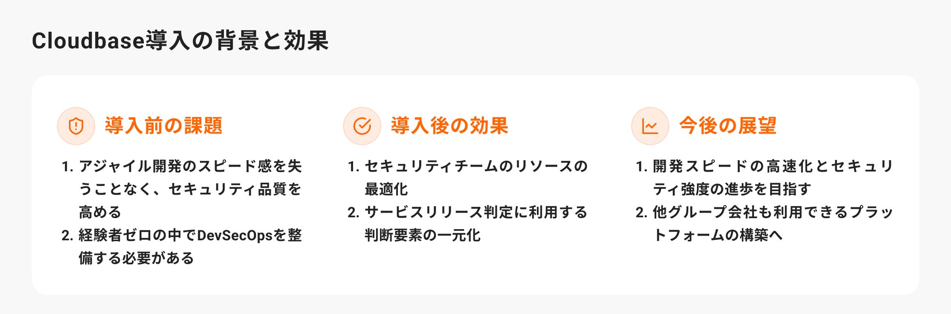 「Cloudbase」を利用することで、開発チームがDevSecOpsを自走できる仕組みが実現したことにより、開発エンジニアのセキュリティ意識とスキルの向上や学習コストの削減、加えてセキュリティチームのリソース配分の最適化につながりました。