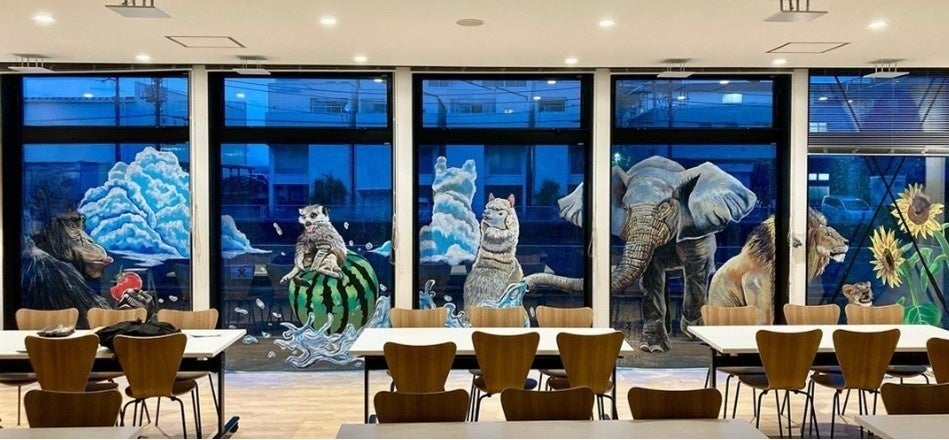 内容:日本理化学工業川崎工場の事務棟ガラス面5面をダイナミックに使って、キットパスウィンドウアートを毎月発表しているアーティスト佐藤周作氏による圧巻の「キットパスライブペイント」を開催。