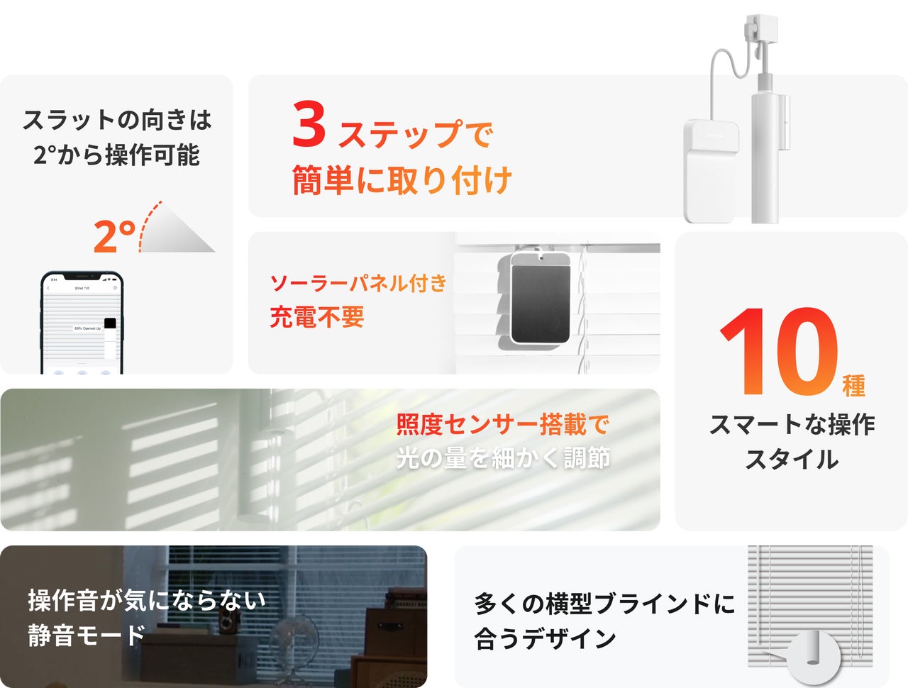 高精度モーターを採用し、SwitchBotアプリ経由でスラットの傾きを2°から調節可能です。