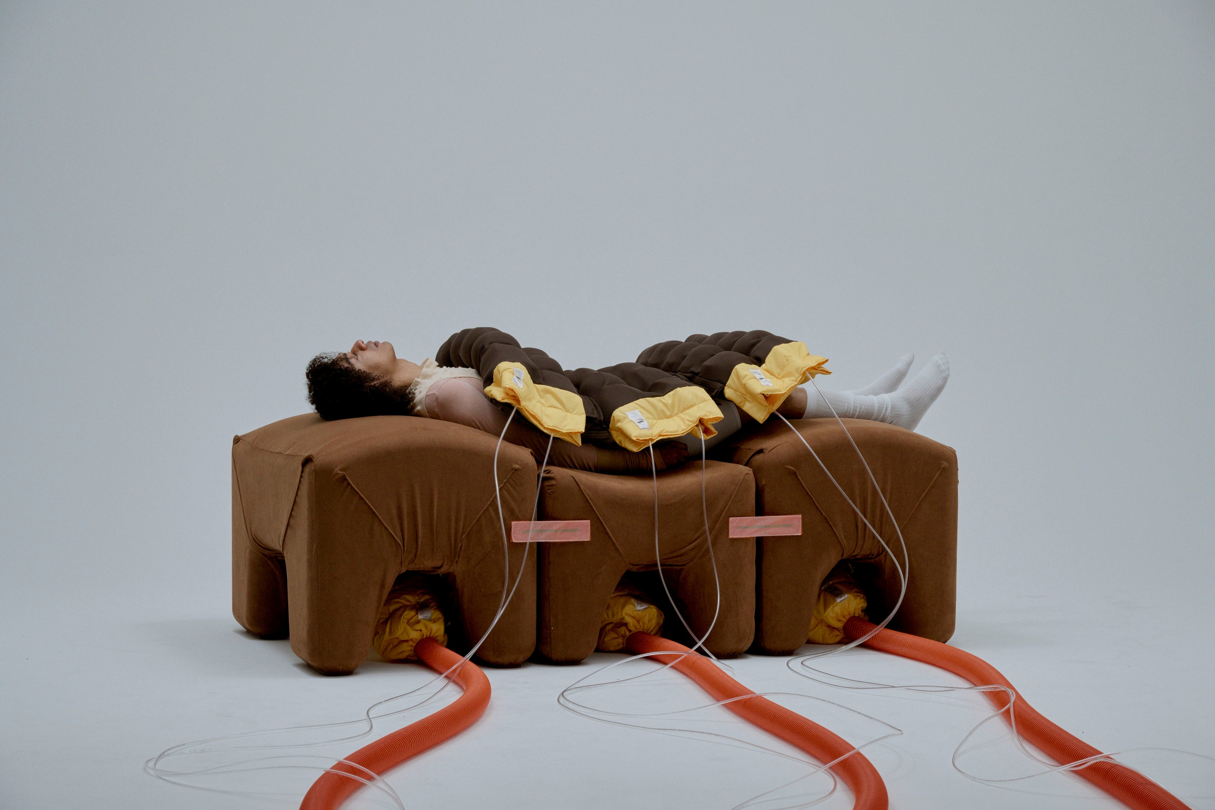 ブリヂストンが研究を重ねてきたゴム人工筋肉と、自然界のモーションを収録・再生するテクノロジーを掛け合わせることで誕生した「Morph」がメインスペースで体験者を迎えます。大きなMorphの上に横たわり、小さなMorphを抱きかかえることで、やわらかいロボットに自らをゆだね、ゆだねられる時間を過ごします。普段は無意識に制御してしまう感情に向き合ったり、目的から解放される感覚を味わっていただきます。