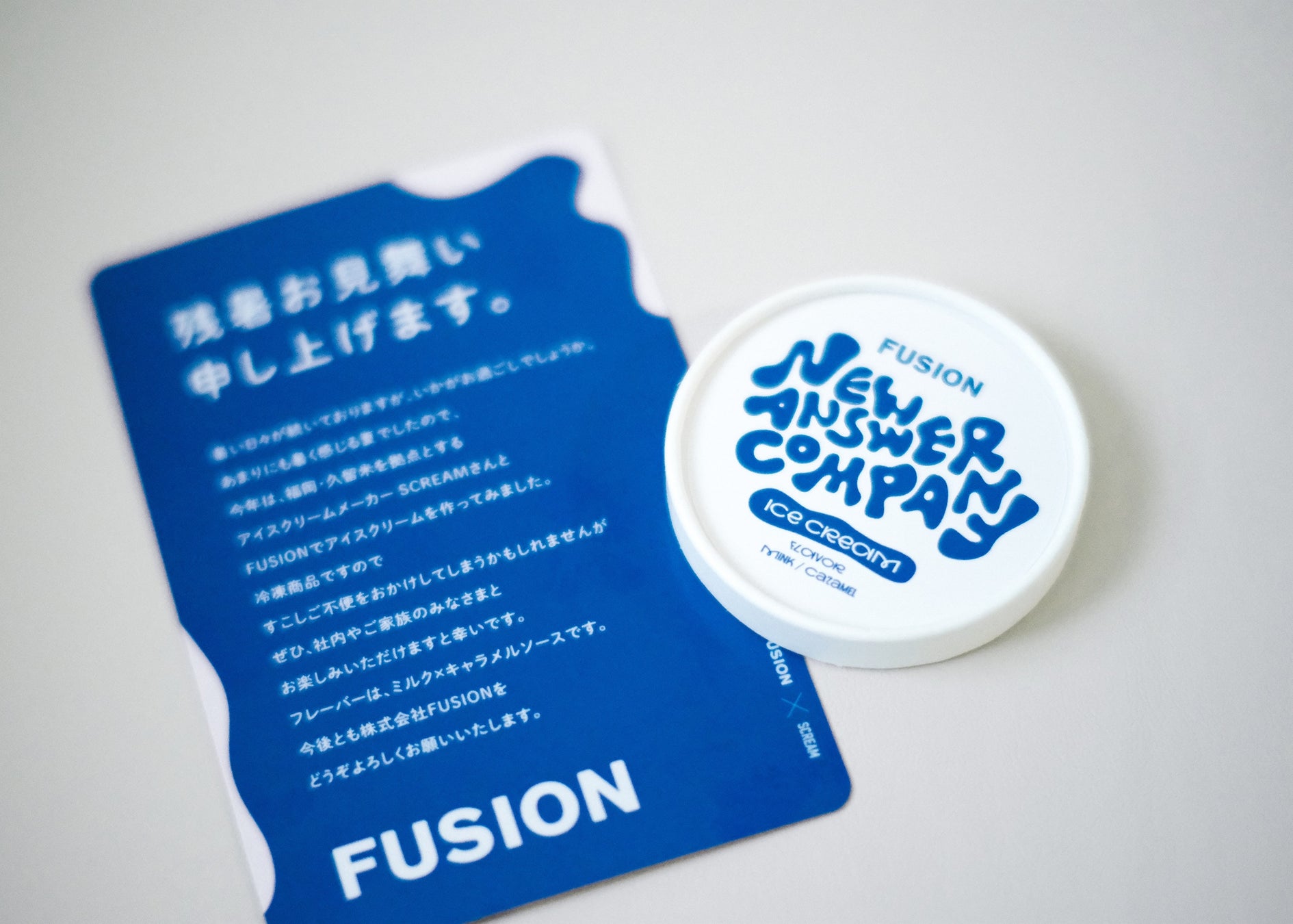 「デジタル」と「クリエイティブ」を掛け合わせ「新しい問いを立て、新しい答えをつくる。」デジタルエージェンシー、株式会社FUSION(本社:東京都渋谷区、代表取締役:前田遼介、以下FUSION)は、2024年夏のお中元(残暑見舞い)として完全オリジナルアイスクリームを制作いたしました。2024年8月19日(月)より順次発送しています。