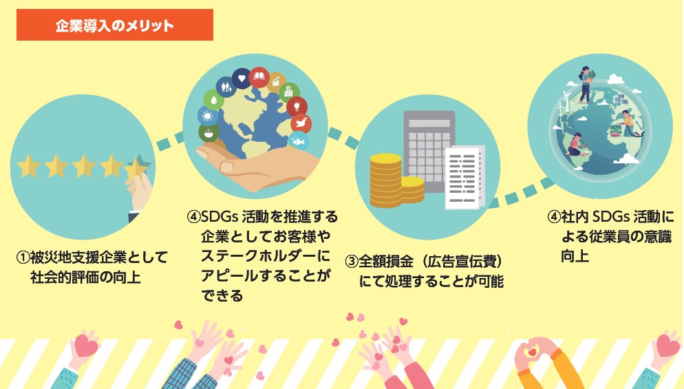 企業・団体の皆さまが被災地(令和6年能登半島地震)支援を通してSDGs活動に参加できるプランとなります。企業・団体の皆さまにご利用いただきやすい設計のSDGsソリューションパッケージとなっております。被災地支援を通して企業の社会的地位向上を始めとし様々なメリットがうまれます。