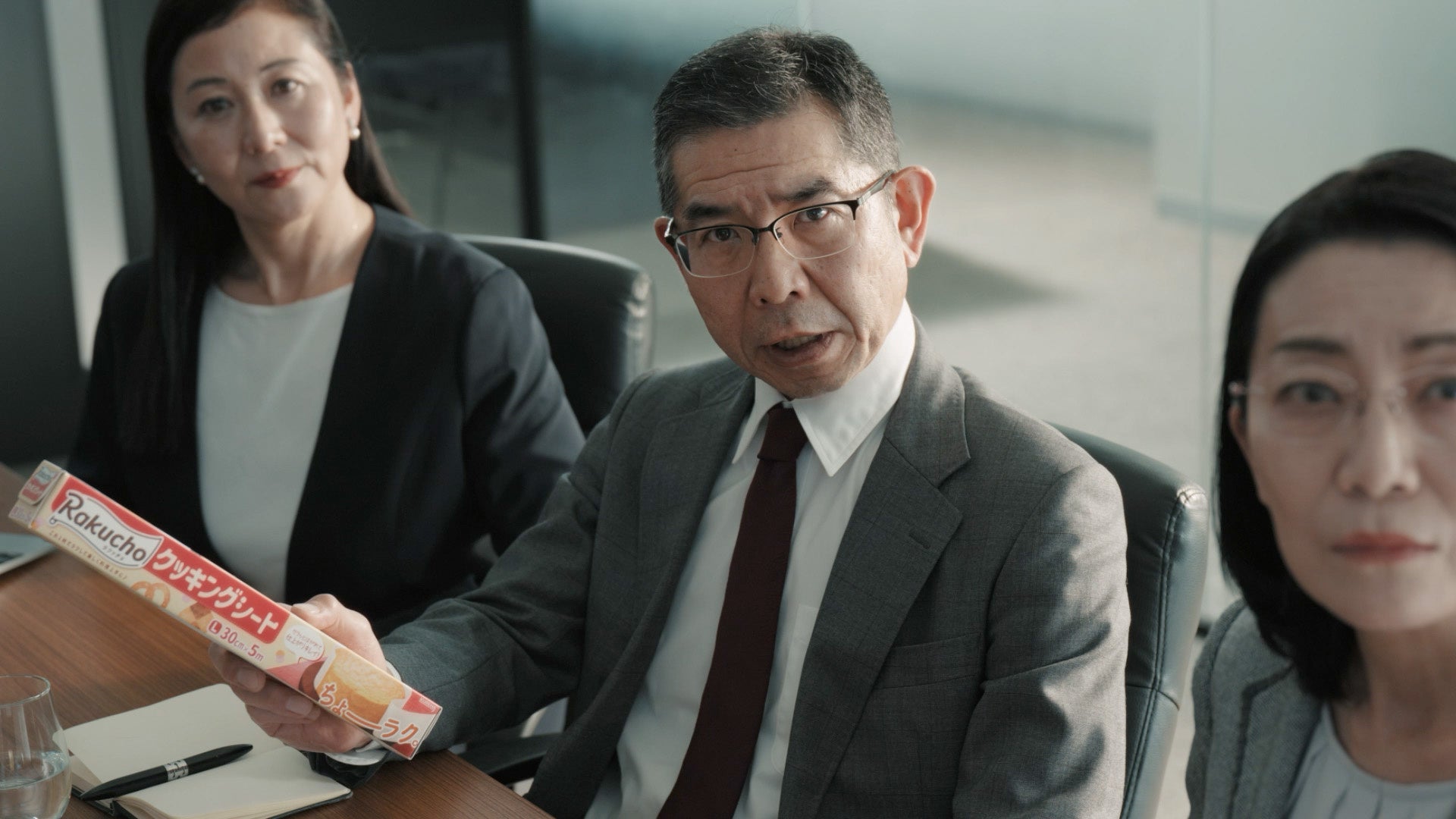 重厚な空気が流れる役員会議室で新ブランド「Rakucho(ラクッチョ)」をプレゼンする商品開発部の松村さん。役員からブランド名の由来を鋭く問われた松村さんは、真っ直ぐな瞳で「『チョ』って可愛いもん♡」と回答します。予想外の答えに強面の役員たちが拍子抜けするなか、たたみかけるように「ラクッチョ♪ラクッチョ♪」とリズムに乗って可愛いポーズを連発!彼女の「あざと可愛さ」と、役員たちとのシュールな対比が見どころです。