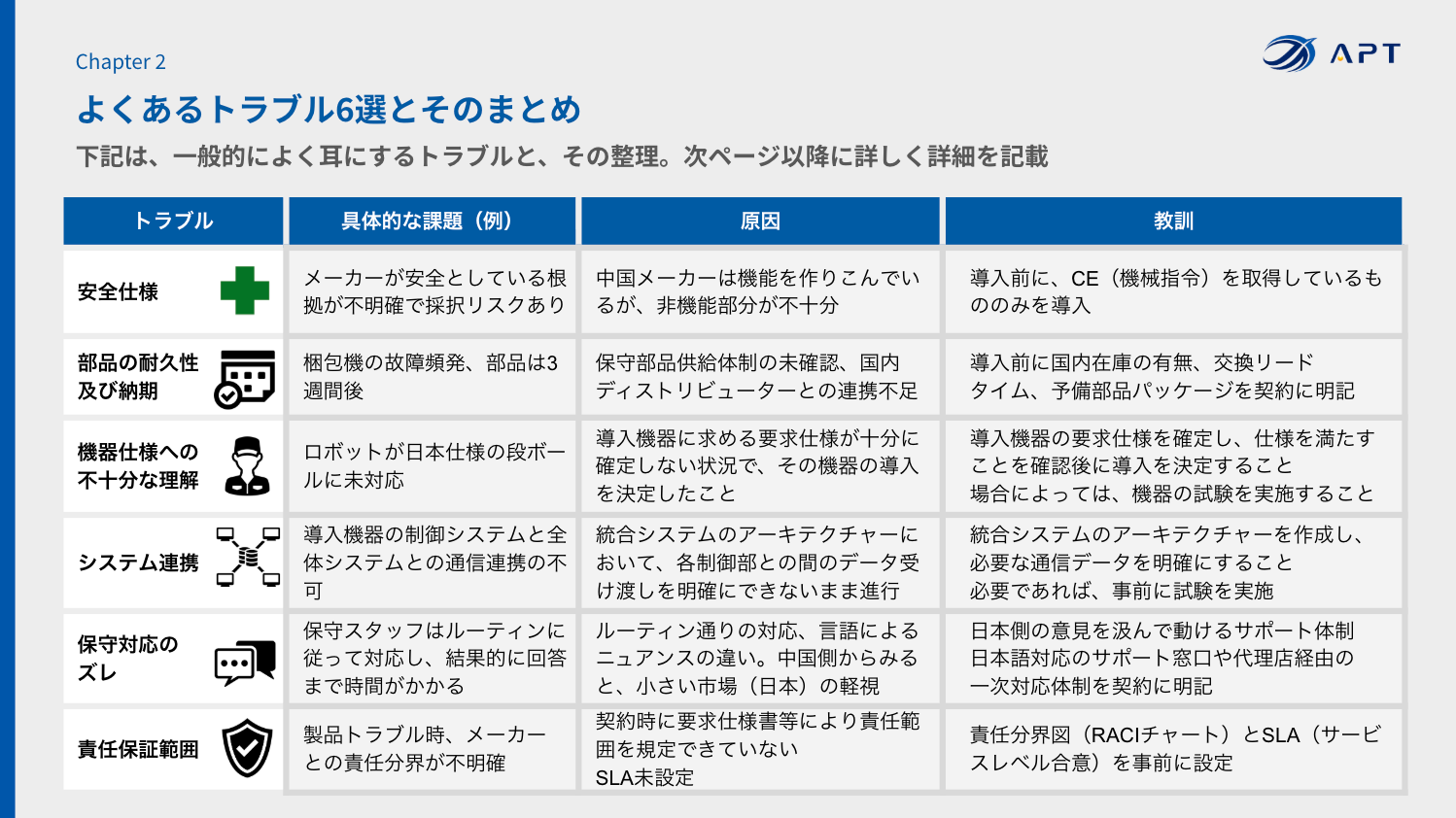 APTでは、これまで多くのお客様から寄せられた相談内容に基づき、海外製品特有の「安全仕様」「部品耐久性」「システム連携」といった課題を整理しました。 使い方や追加費用の見込み方次第で回避できるトラブルも多く、導入を検討中の企業が適切な判断を行えるよう、本ホワイトペーパーを執筆いたしました。