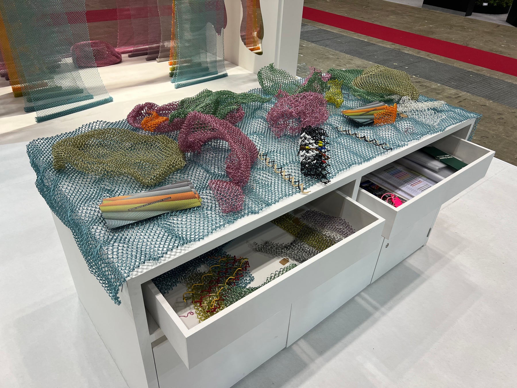 そこで、「空間出展」ブースには、その「空間」の前、少し離れた場所に必ず「マテリアルカウンター」を設置し、出展企業にはその場所で、「空間」を見ながら出展している製品(素材)についての商談を行う、という展示形式を採用することにしました。この展示方法を採用することで、「空間」の方は全力でデザイナーの「作品」として、作り上げることができ、一方で出展した出展者にとっては、しっかりと素材を訴求・商談ができる、という図式が出来上がります。デザイナー・出展者双方にとって、満足度の高い、展示方法です。この手法は毎年好評で、当社代表竹村が編み出した、空間マテリアルを確実に訴求させ、出展社の満足度を高める方法です。
