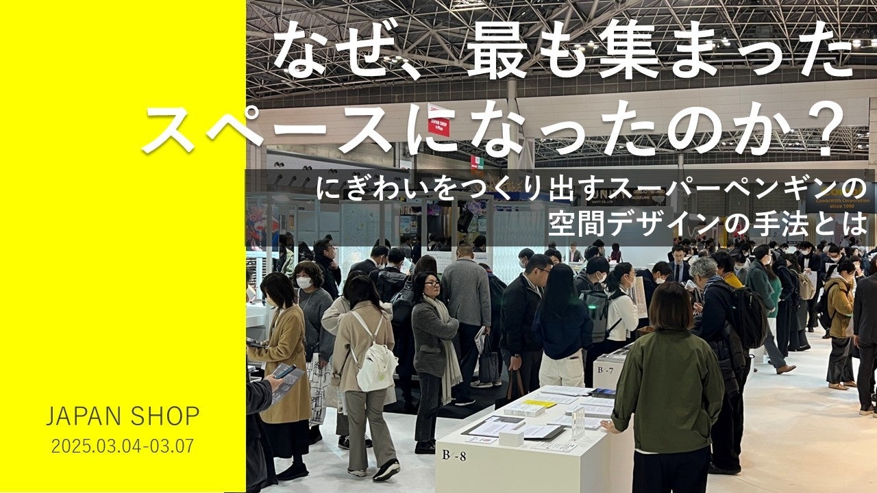SUPER PENGUIN株式会社(東京都品川区 代表取締役 ⽵村尚久/以下、スーパーペンギン)は、2025年3月4日(火)~7日(金)に東京ビッグサイトにて開催された「JAPANSHOP2025 店舗総合見本市」にて、「IDMエリア」の全体プロデュース・ブースデザインを行った他、IDM内に「Immersive Space」を自社出展。その他、会場にある企業単独出展ブース(株式会社ウォーターパール、Centorオーストラリア、商店建築ラウンジ、震災復興ブース)のブースデザインを行いました。今回、今回のJAPANSHOPに出展した各出展社様に、IDMブース出展者様、株式会社ウォーターパール、商店建築ラウンジ等のご担当者様に、スーパーペンギンの印象・感想についてインタビューを行いました。