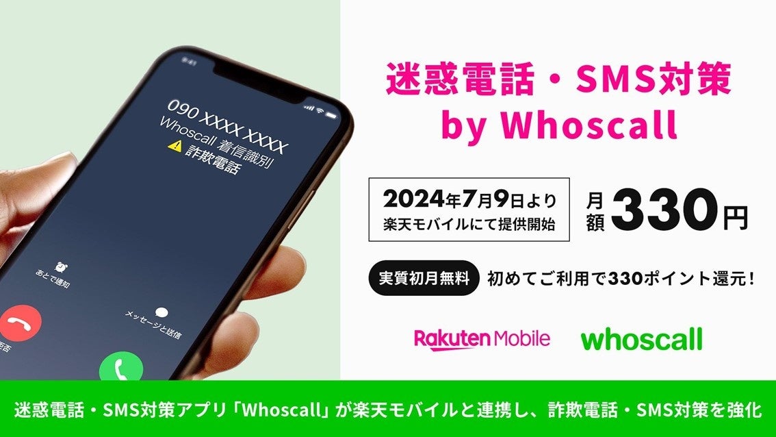 また、この提携を開始するにあたり、「迷惑電話・SMS対策 by Whoscall」をご利用のお客様に330円相当分の「楽天ポイント」を還元する「【迷惑電話・SMS対策 by Whoscall】料金実質初月無料特典」キャンペーンを実施いたします。