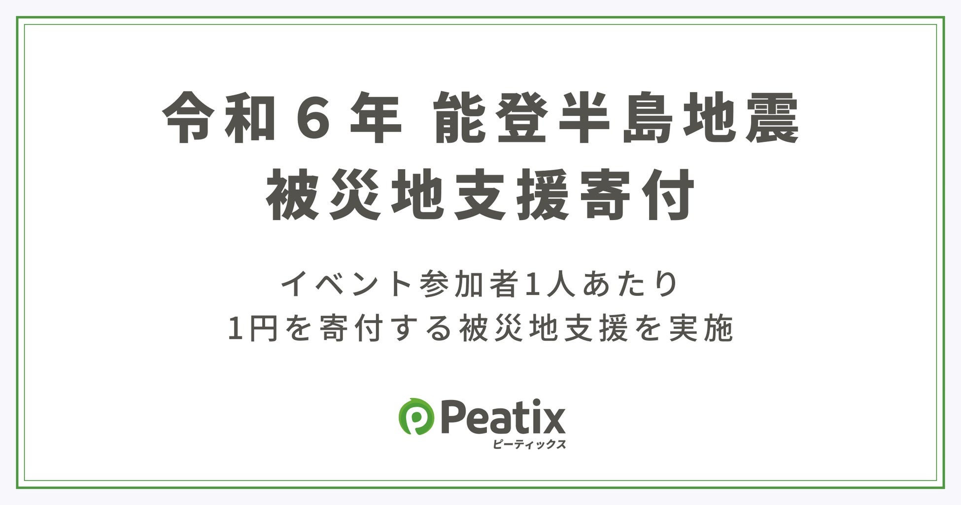 令和6年能登半島地震で被災された方々を支援するため、2024年1月1日〜2024年3月31日の期間にて、有料・無料、開催国を問わず、「ピーティックスを利用したイベント参加者1人あたり1円」を日本赤十字社を通じて被災地へ寄付します。