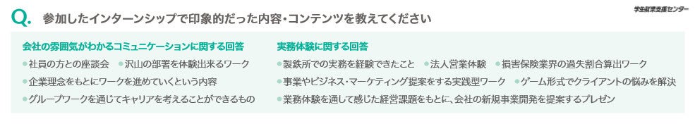 学生に夏期インターンシップのコンテンツについて、「印象的だった内容・コンテンツ」では、会社の雰囲気がわかるコミュニケーションについて好感を持つ意見が多数あり、実務体験と並んで評価されていました。