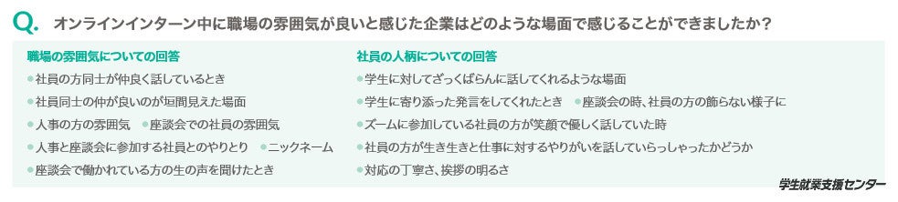 オンラインインターン中に職場の雰囲気が良いと感じた企業はどのような場面で感じることができましたか?