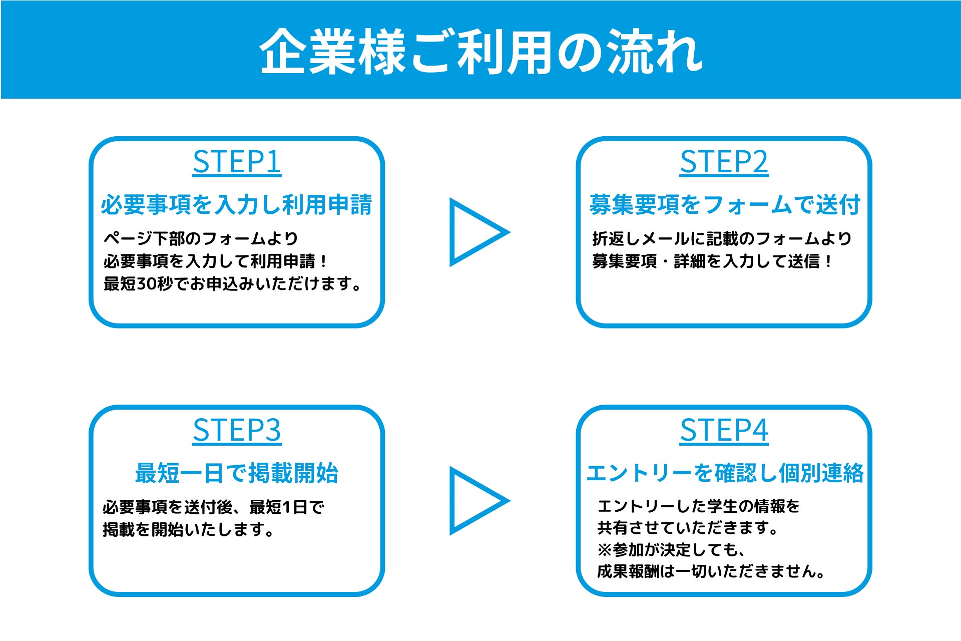 短期・中期どちらのインターンシップスタイルも掲載可能で、全国の学生へアプローチすることができます