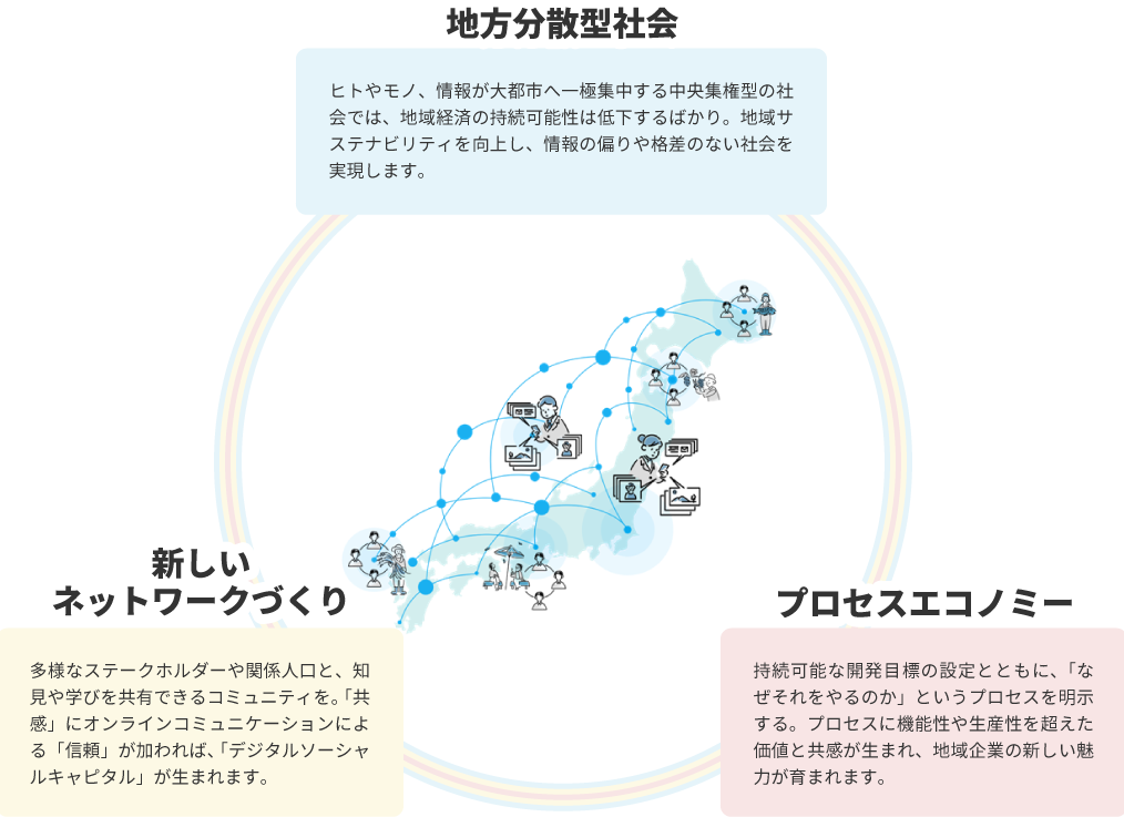 持続可能な地域経済の発展と産業活性を促し、地方分散型社会を見据えた新しいネットワークづくりや、地域企業の魅力発信を支援しています。