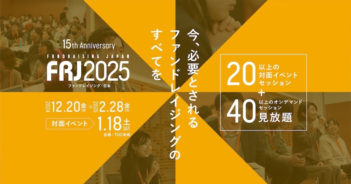 寄付・社会的投資が進む社会の実現を目指す認定特定非営利活動法人日本ファンドレイジング協会は、15回目となるファンドレイジングカンファレンス「FRJ2025 | ファンドレイジング・日本」を2024年12月20日(金)から2025年2月28日(金)の71日間にわたり開催します。この度、2025年1月18日(土)に開催する対面イベントの注目セッションを紹介する特別Youtubeライブを実施することをご案内します。