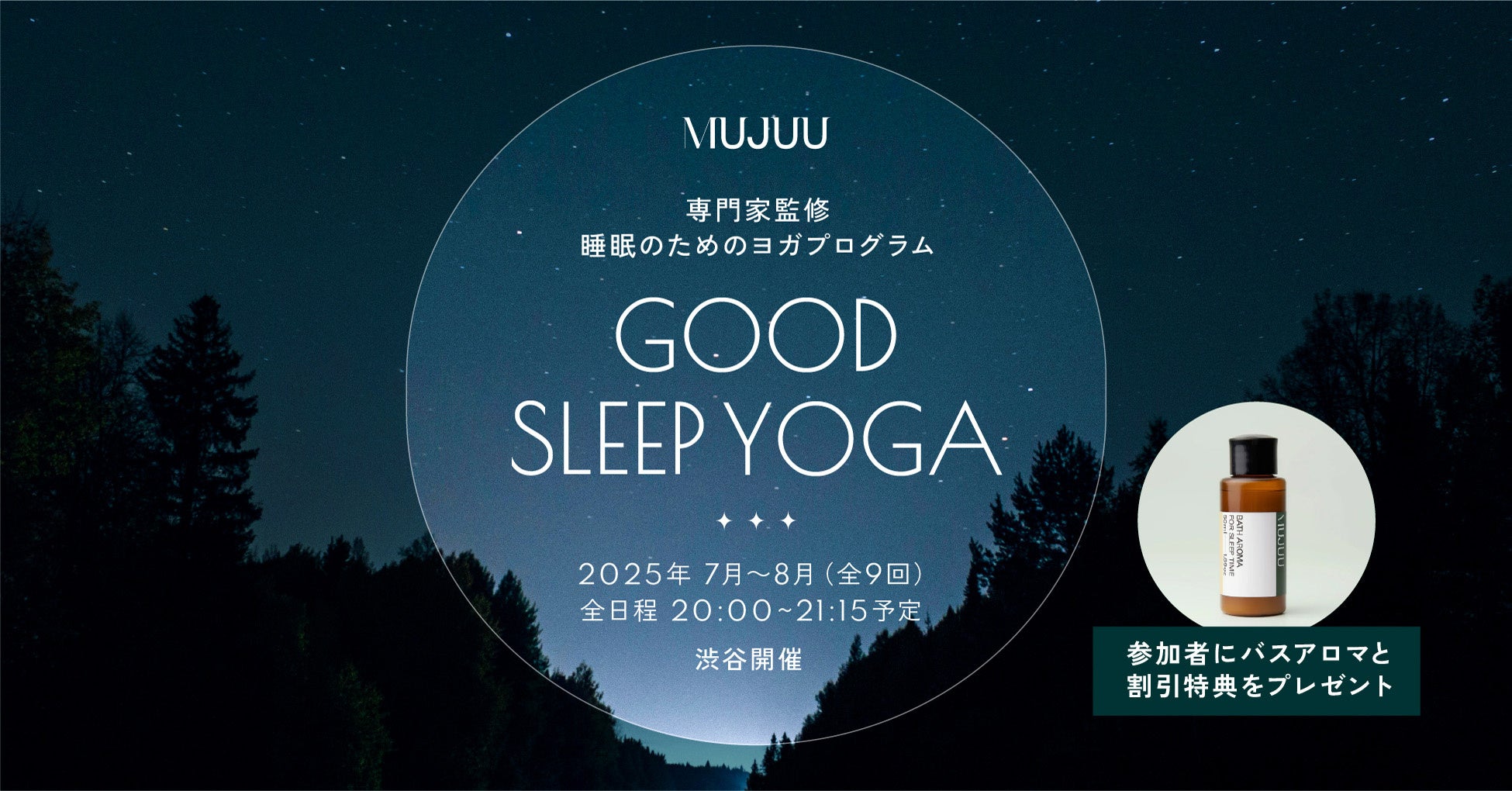 「GOOD SLEEP YOGA」は、上級睡眠改善インストラクターの安達直美氏監修の下、睡眠アロマブランドMUJUUとヨガインストラクター Erika Uedaが共同開発。睡眠の質に大きく関わるとされている①呼吸、②体温、③瞑想の3つに着目し、ヨガのフローや呼吸法、そして睡眠に特化したMUJUUの香りによってベストな睡眠前のコンディションに導くためのプログラムです。ヨガを「動く瞑想」として捉え、 身体の状態を整えるとともに、心を落ち着け、自然な眠りにつくことを促します。
