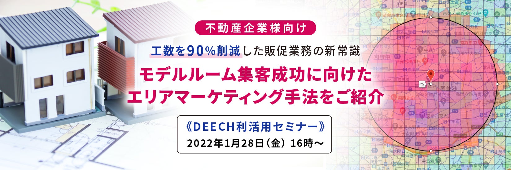 株式会社DEECH (本社: 東京都中央区、代表取締役: 小菅義和)は1月28日(金)に、「不動産企業向け「工数90%を削減した販促業務の新常識 モデルルーム集客成功に向けたエリアマーケティング手法」と題した無料ウェビナーを開催いたします。