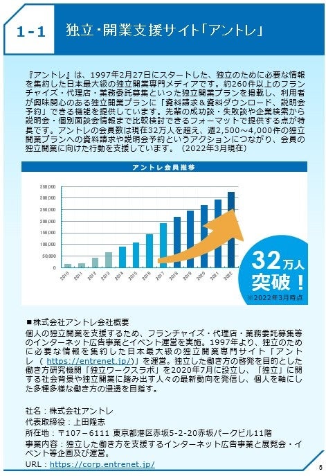 1997年2月より、独立のために必要な情報を集約した日本最大級の独立開業専門メディア。利用者の興味関心のある独立開業プランへの「資料請求&資料ダウンロード、説明会予約」機能を提供。先輩の [グラフィカル ユーザー インターフェイス 自動的に生成された説明] 成功談・失敗談や企業検索から説明会・個別面談会情報まで比較検討できるフォーマットで提供する点が特長。アントレの会員数は32万人を超え、250件以上のフランチャイズ・代理店・業務委託募集といった独立開業プランを掲載することで、週2,500~4,000件の資料請求や説明会予約につながっている。(2022年3月現在)