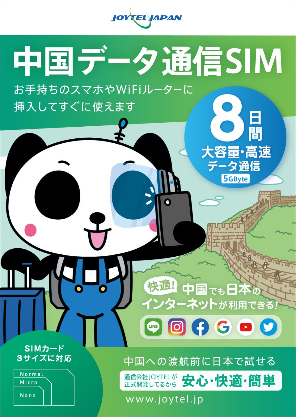 中国で8日間利用可能なデータ通信専用SIMです。ジョイテル株式会社が中国大手通信会社と正式提携して販売する正規日本語版です。