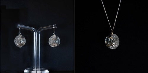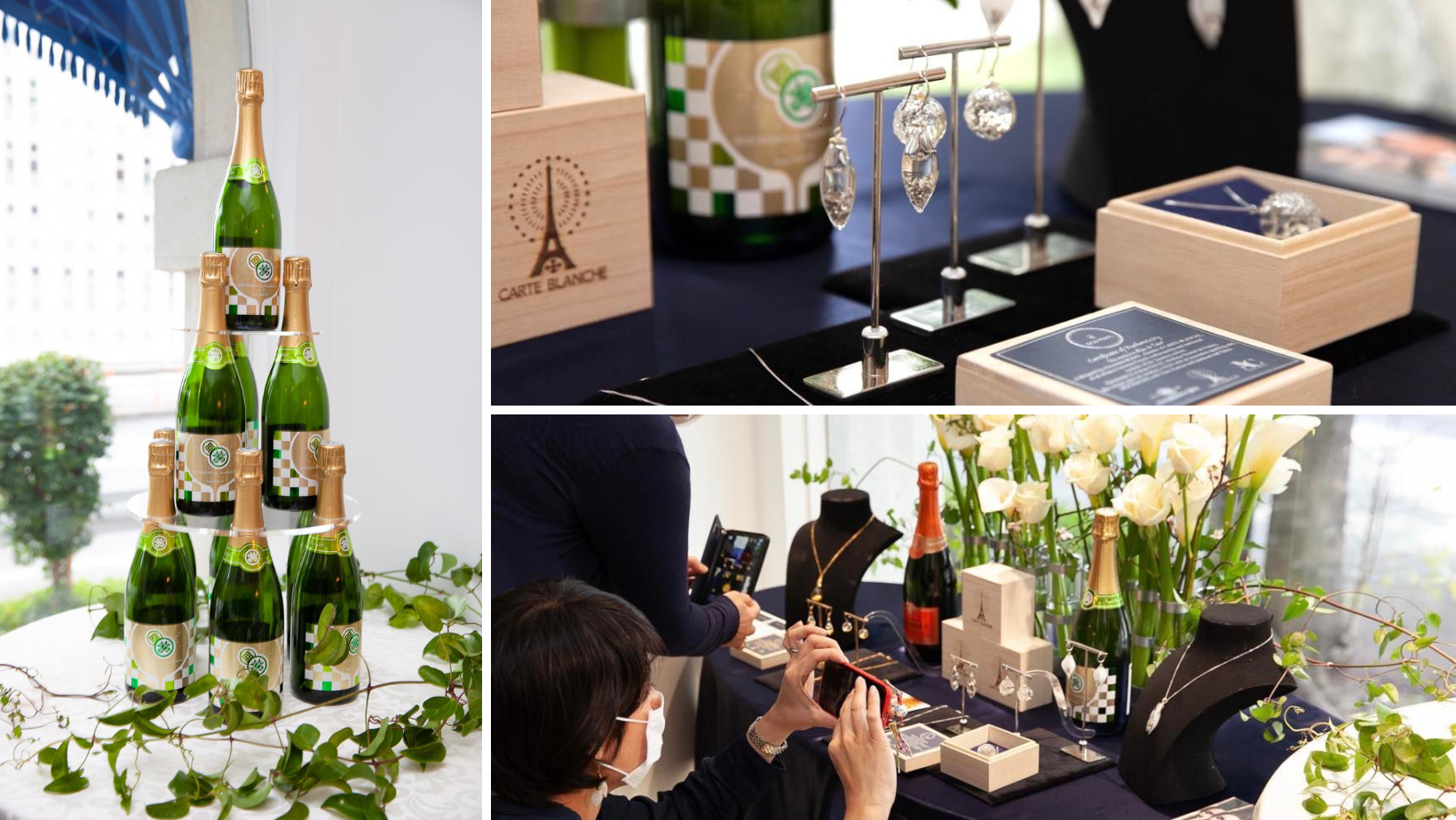 Bijou de Saké 「ビジュ・ドゥ・サケ」コレクションはCARTE BLANCHE社が展開するアクセサリーブランドBijoux Pétillantsの第二弾コレクションです。本ブランドではシャンパンをはじめとするスパークリング酒をガラスアートの中に封じ込める手法を用いたアクセサリーが展開されており、その中でスパークリング日本酒が採用されるのは世界初となります。