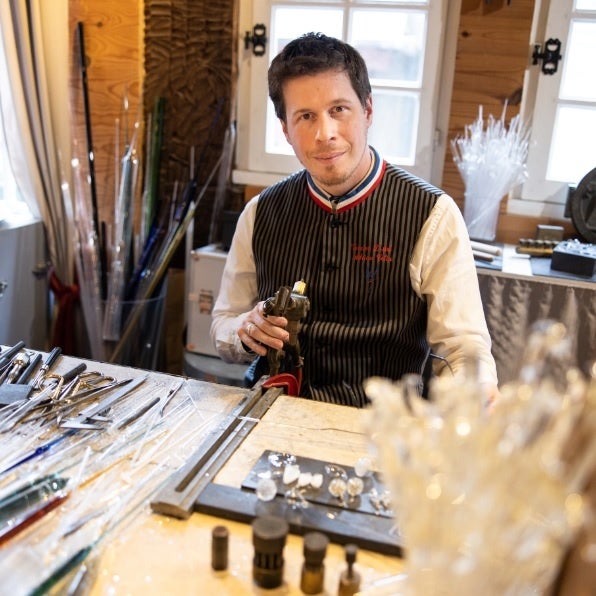 アドリアン・コラン氏は2011年、27歳という最年少でガラス工芸部門において17人目となるフランス最高勲章である国家最優秀職人章(M.O.F.)を受賞し、さらに2014年には人間国宝一歩手前のメートル・アルティザンも受賞したガラス職人です。現在は自身のコレクションとは別に、著名メゾン (CHANEL, DIOR, CARON, CARTIER, TAITTINGERなど) をはじめ、様々なデザイナーやクリエーター、ラグジュアリーメゾンとのコラボレーションも実現しています。